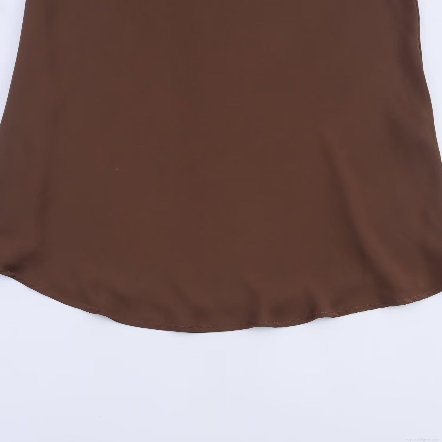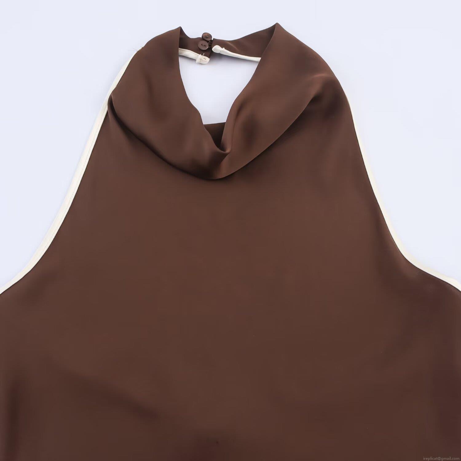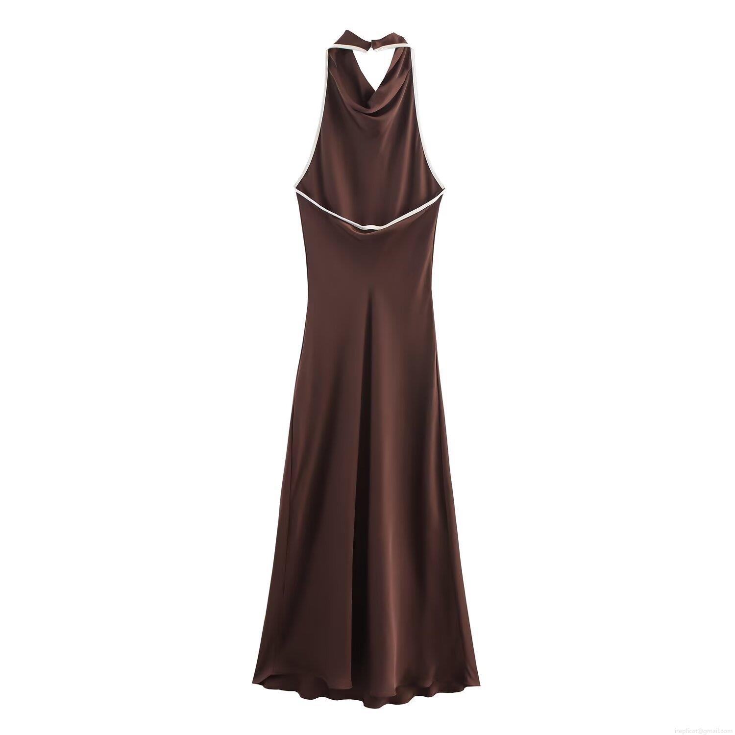 Women's Sexy Halter Neck Satin Midi Dress Backless Dark Brown Contrast Trim A-Line Sleeveless Party Club Evening Chic Dress
