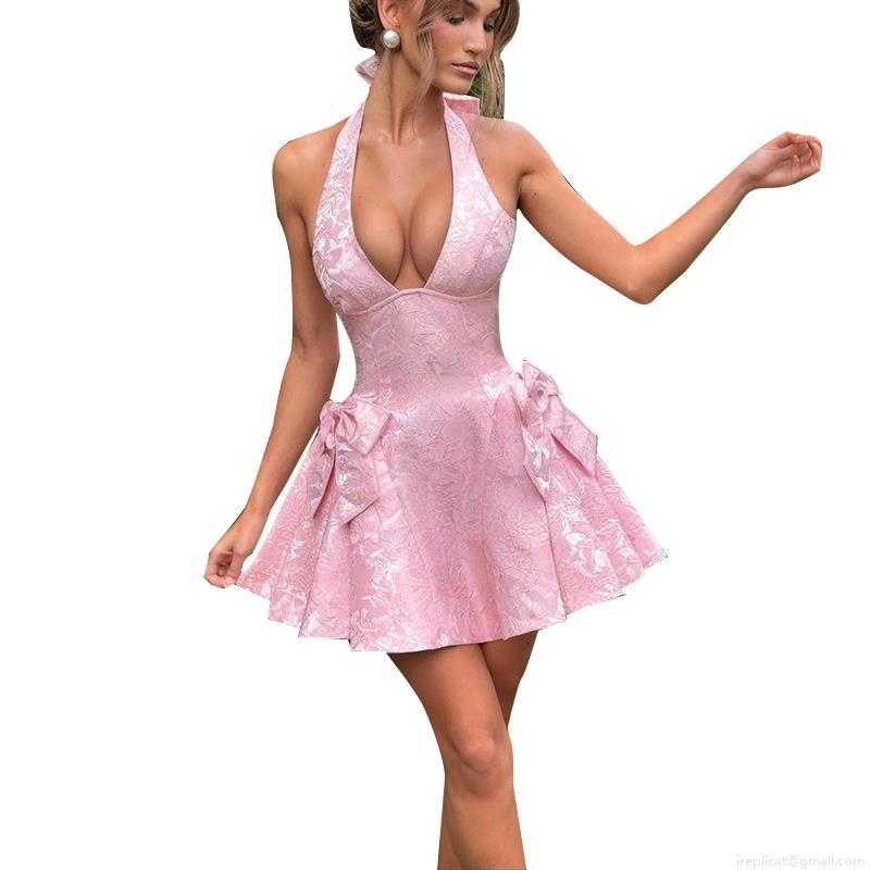 • Women's Sexy Halter V-Neck Jacquard Mini Dress Elegant Backless A-Line Party Dress With Bow Decor Sleeveless Polyester Cocktail Wedding Guest Dress