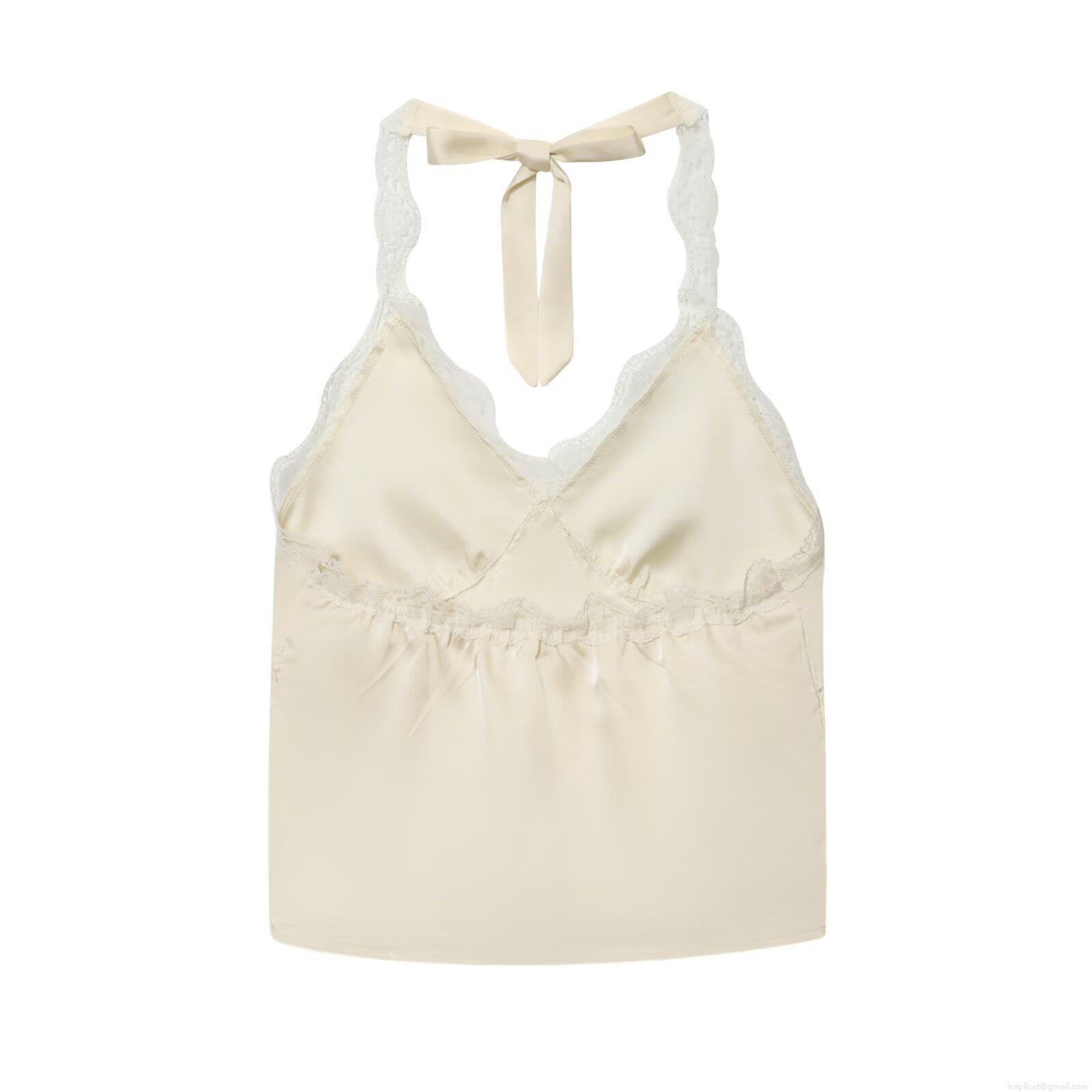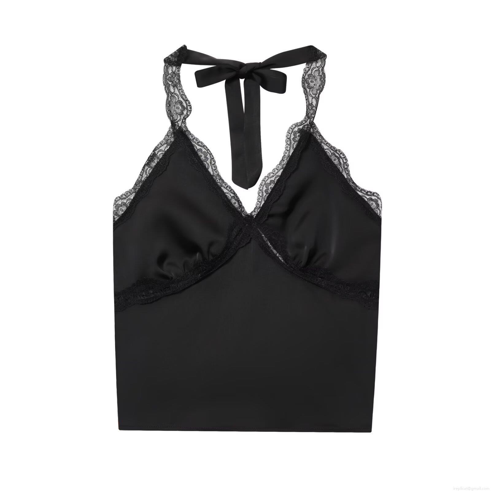 • Women's Sexy Lace Trim Satin Halter Top V-Neck Backless Cami Crop Top Silk Smooth Bow Tie Tank Top For Summer Party Clubwear