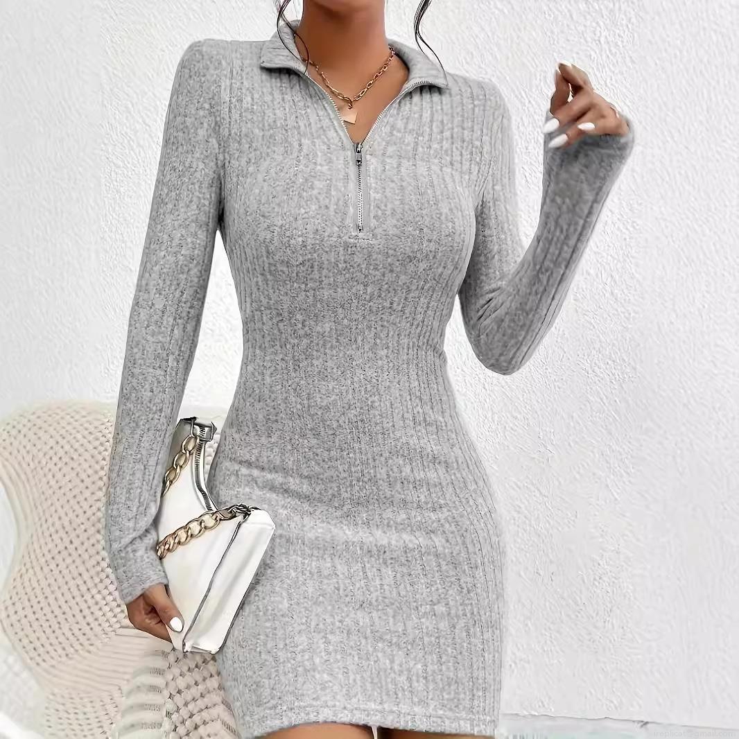 • Women's Sexy Long Sleeve Knit Ribbed Mini Dress Half Zip Polo Collar Bodycon Sweater Dress Slim Fit Solid Color Casual Fall Winter Short Dress