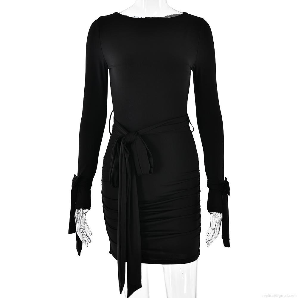 Women's Sexy Long Sleeve Ruched Bodycon Mini Dress Milk Silk Round Neck Slim Fit Party Dress with Bow Tie and Waist Drawstring Streetwear