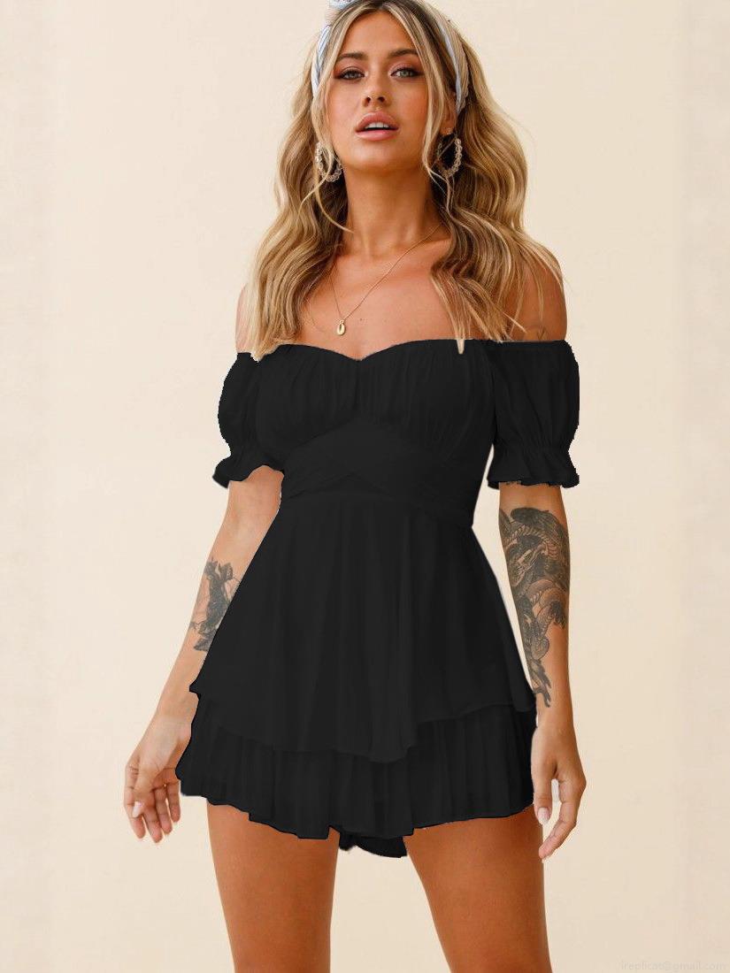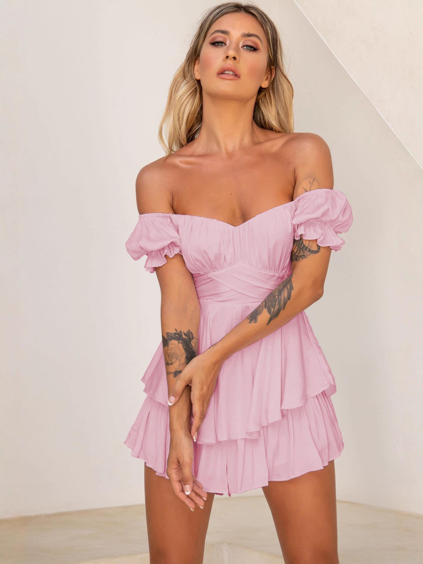• Women's Sexy Off-The-Shoulder Tiered Mini Dress Fashion Lantern Sleeve Cake Skirt Layered Romper Dress Solid Color Elegant Chiffon Dress For Summer Vacation Party Date