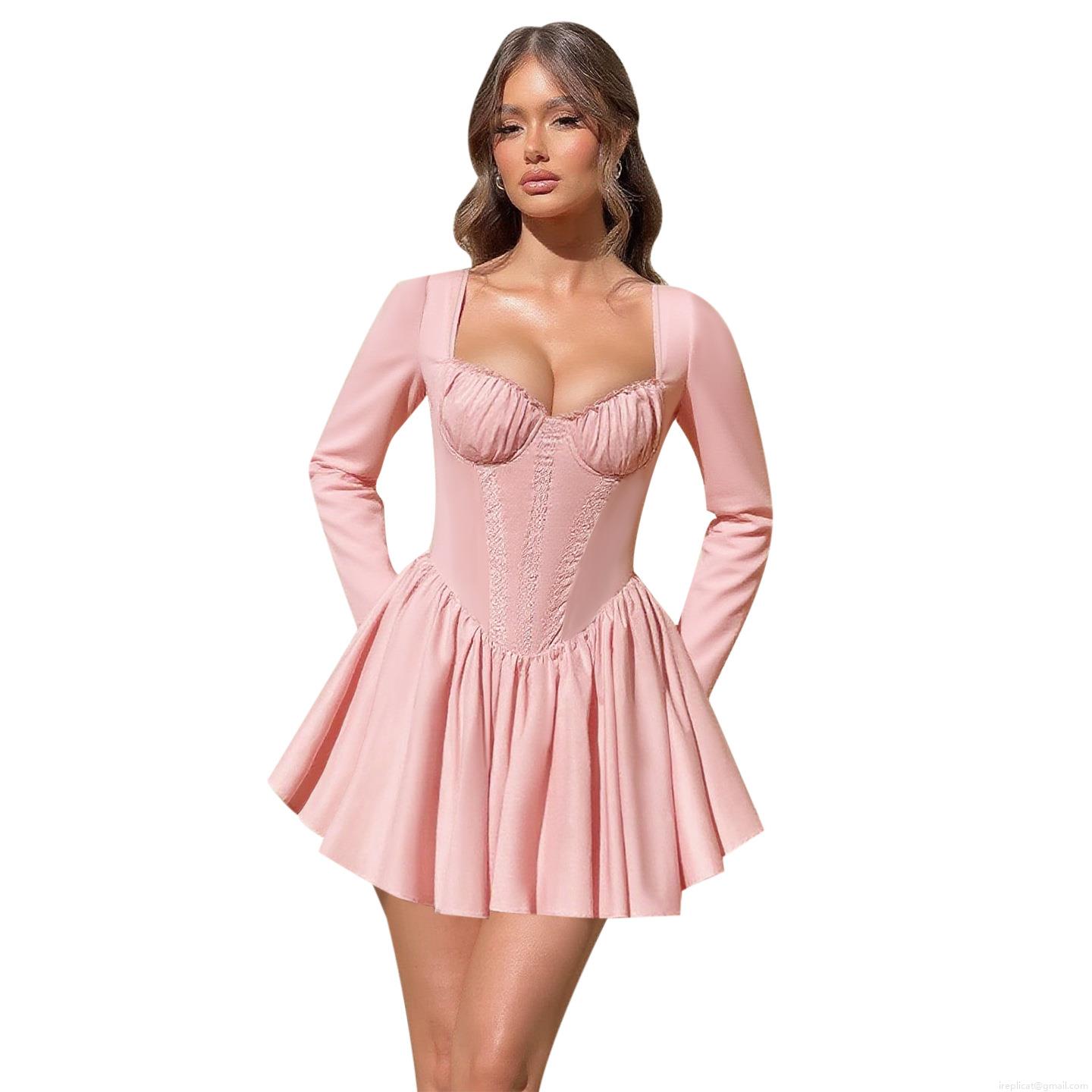 • Women's Sexy Pink Corset Long Sleeve Mini Dress Polyester Spandex Knitted Slim Fit Pleated Lace Trim Bodycon Party Dress for Autumn