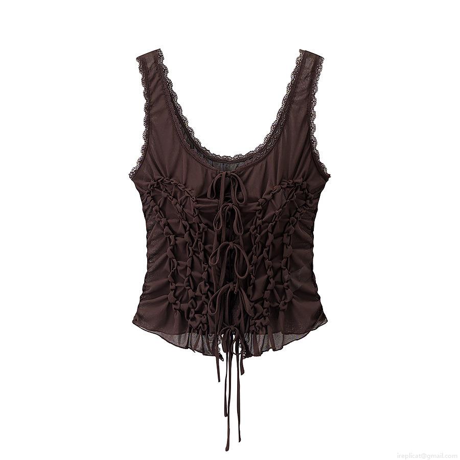 • Women's Sexy Ruched Camisole Top Lace Trim V-Neck Tie Front Mesh Tank Top Vintage Sweet Slim Fit Sleeveless Shirt Polyester Solid Color Party Clubwear Blouse