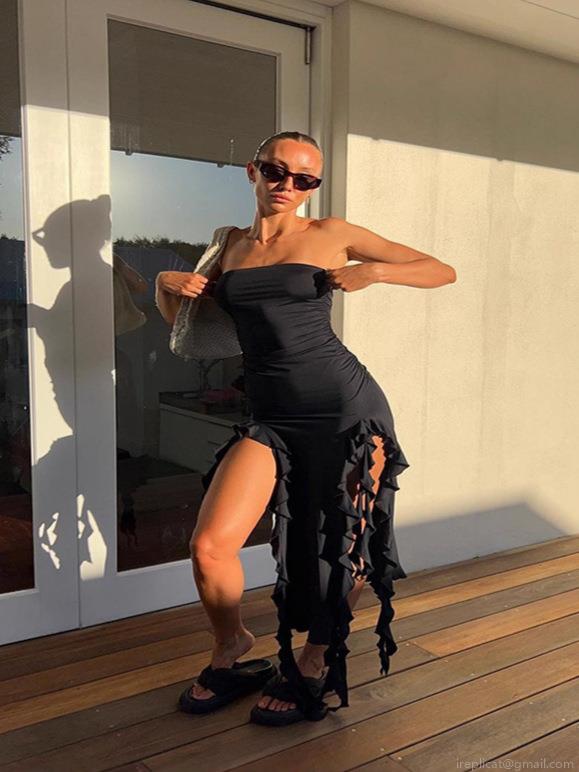 • Women's Sexy Ruched Tube Top Midi Dress With Ruffles High Slit Irregular Hem Polyester Elastane Strapless Bodycon Sundress For Summer Beach Vacation Party