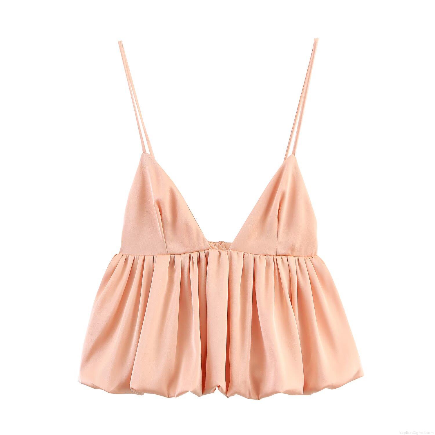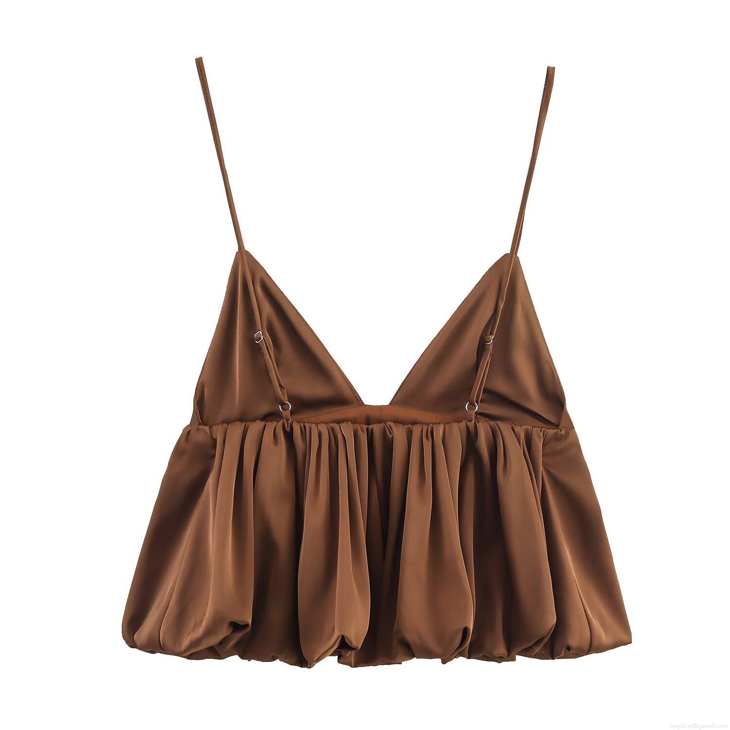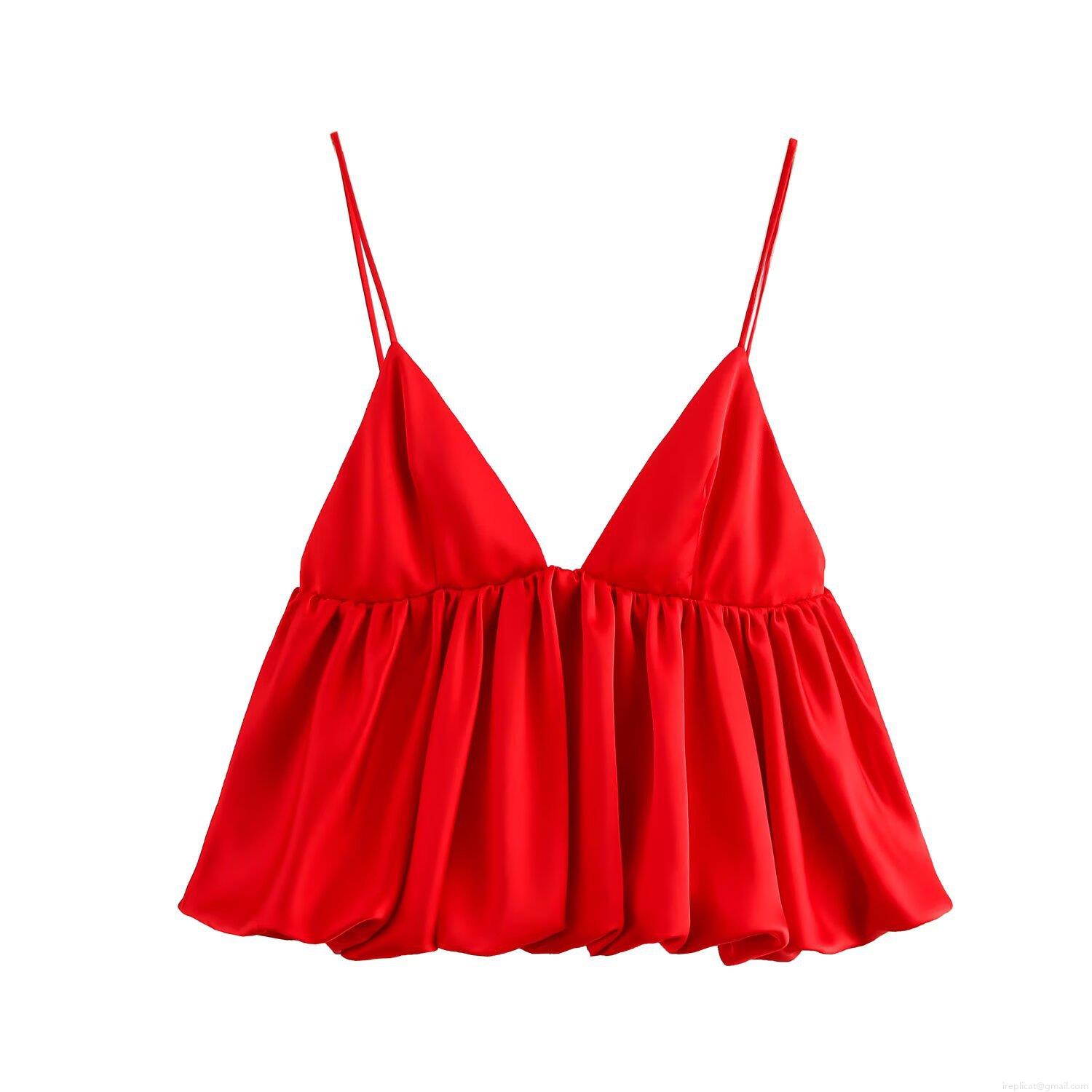• Women's Sexy Satin Camisole Top Deep V Neck Spaghetti Strap Bubble Hem Puffy Crop Top Elegant Solid Color Party Clubwear Tank Top