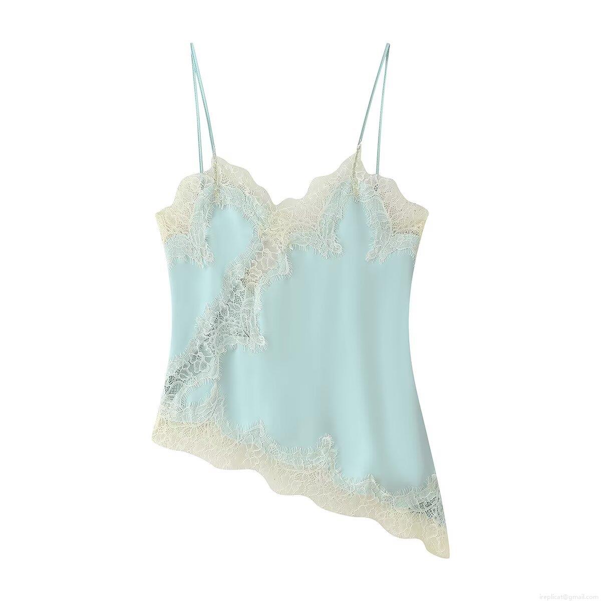 Women's Sexy Satin Camisole Top Lace Trim Patchwork Asymmetric Hem V-Neck Sleeveless Sling Top Summer Party Clubwear For Ladies