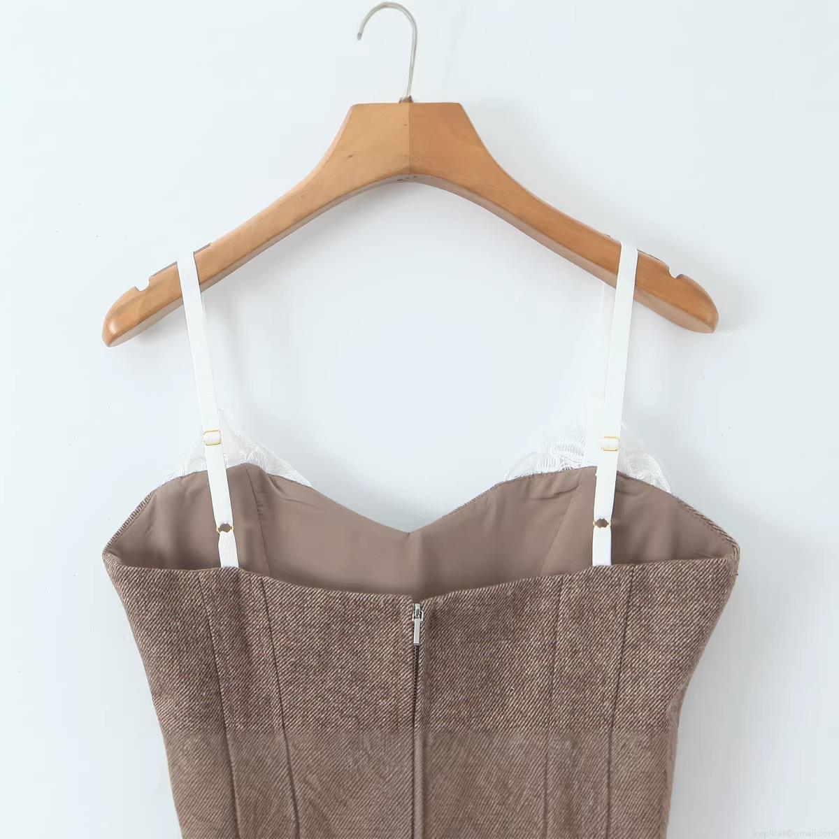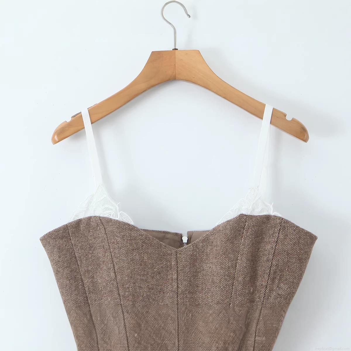 • Women's Sexy Vintage Corset Top Brown Twill Lace Patchwork Bustier Slim Fit Summer Sleeveless Crop Top With Adjustable Straps And Back Zipper For Streetwear Party
