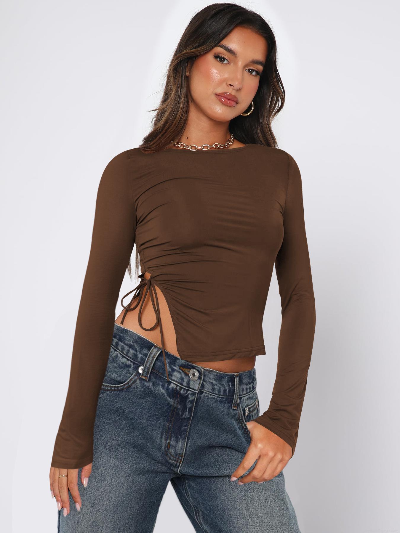 • Women's Sexy Y2K Long Sleeve T-Shirt Slim Fit Polyamide Spandex Knitted Top With Drawstring Cutout Detail For Daily Party Streetwear