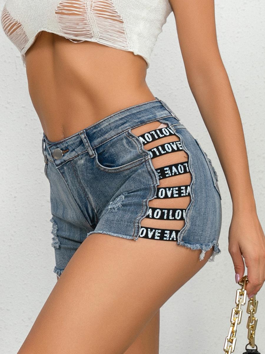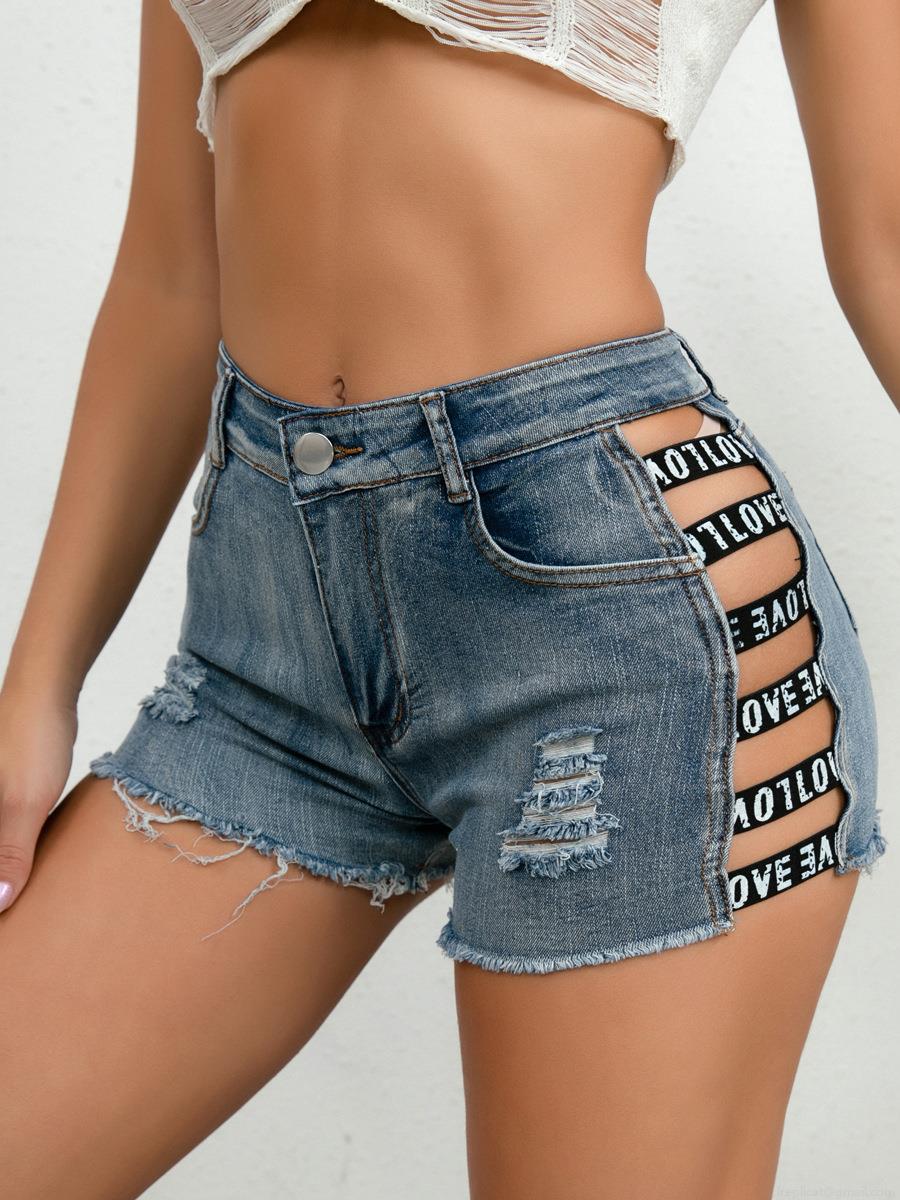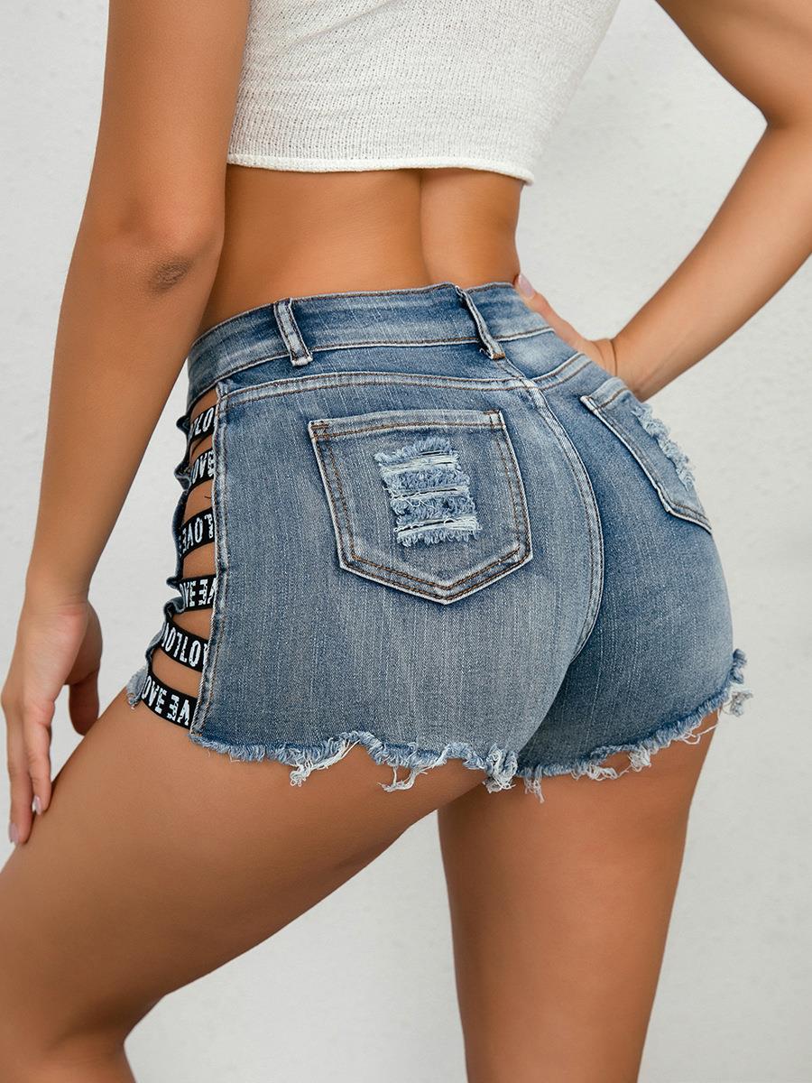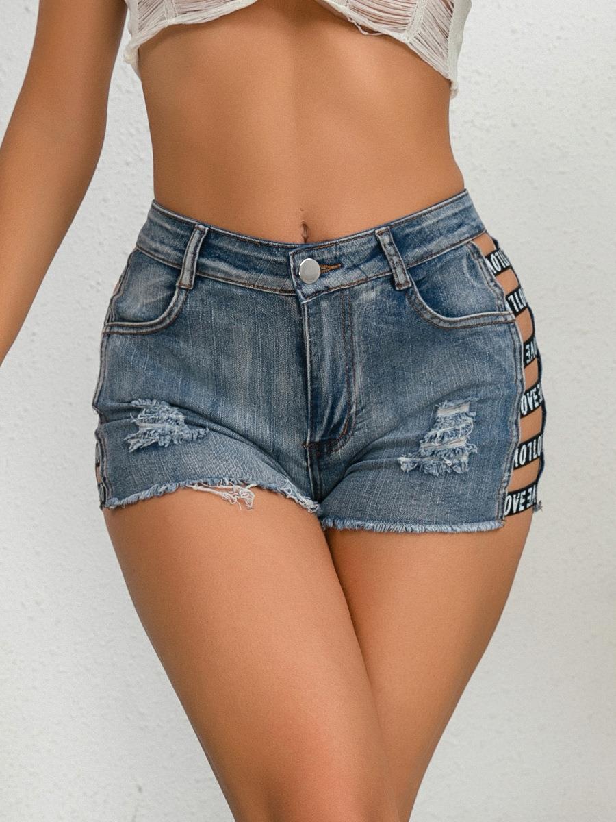 Sexy High Waist Ripped Denim Shorts for Women With Side Cut-Out Letter Print Webbing Distressed Fringe Hem Summer Jean Shorts