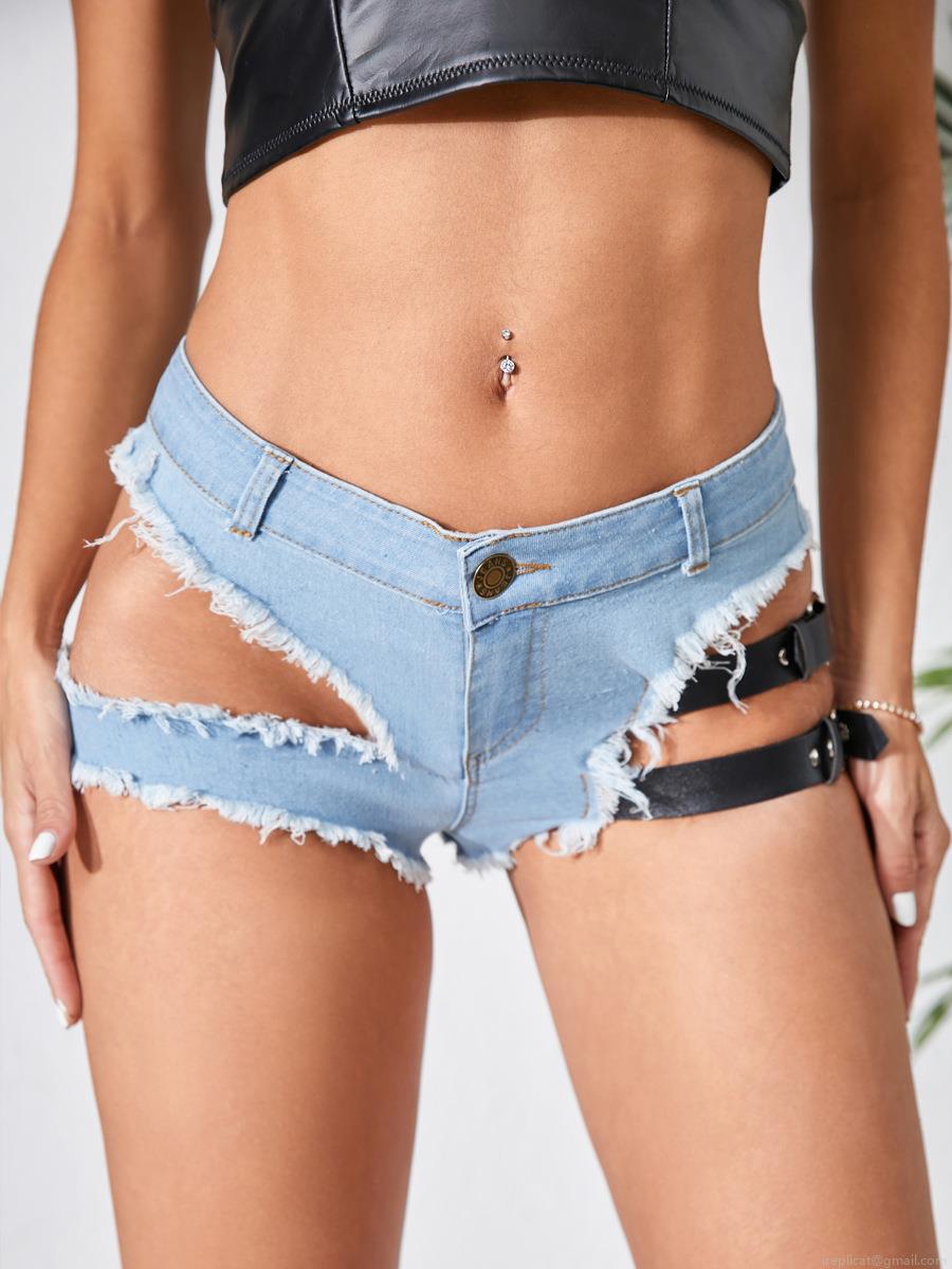 • Sexy Hollow Out Denim Shorts Women Punk Ripped Distressed Low Waist Hot Pants With Black Buckle Straps Raw Hem Clubwear Summer Jean Shorts