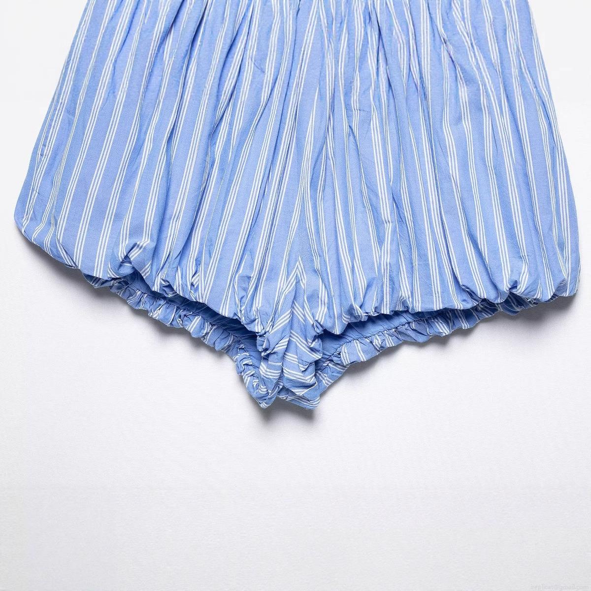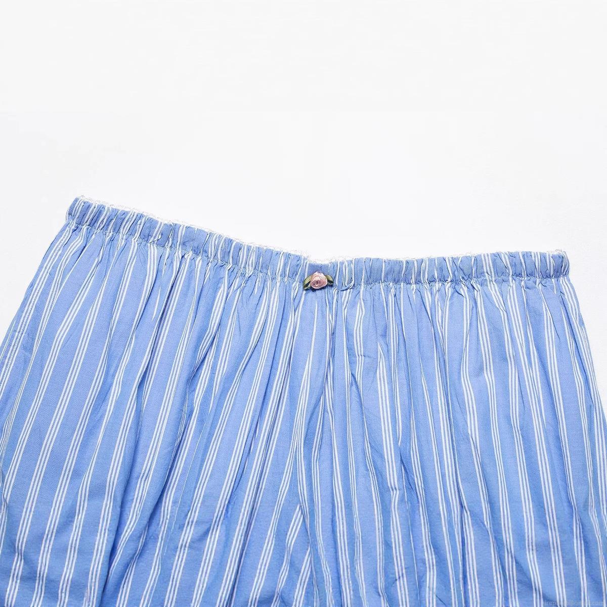 • Women French Style Blue White Striped Puffy Mini Shorts Sweet Elastic Waist Bloomers With Pink Flower Decoration Comfortable Cotton Blend Summer Loungewear Shorts