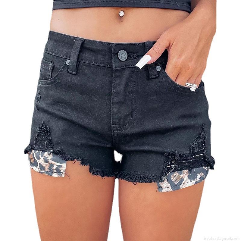 • Women High Waist Denim Shorts Ripped Distressed Leopard Print Pocket A-Line Hot Pants Fringe Hem Summer Streetwear Jeans For Ladies