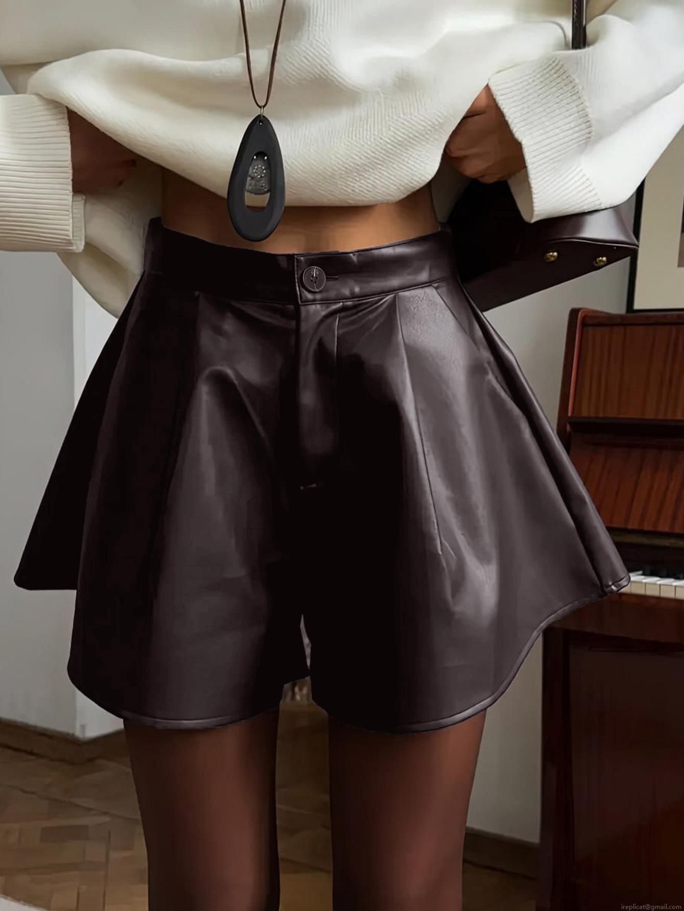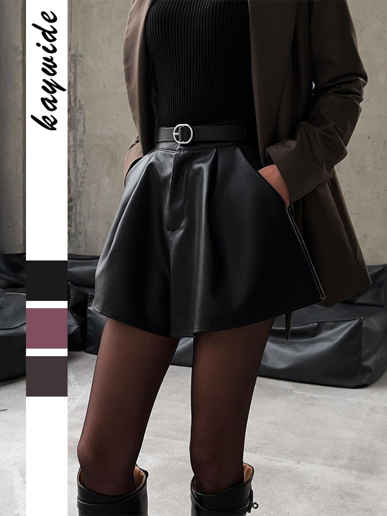 • Women High Waist PU Leather Shorts With Belt Elegant Solid Color A-Line Wide Leg Short Pants For Office Party Autumn Winter Faux Leather Shorts