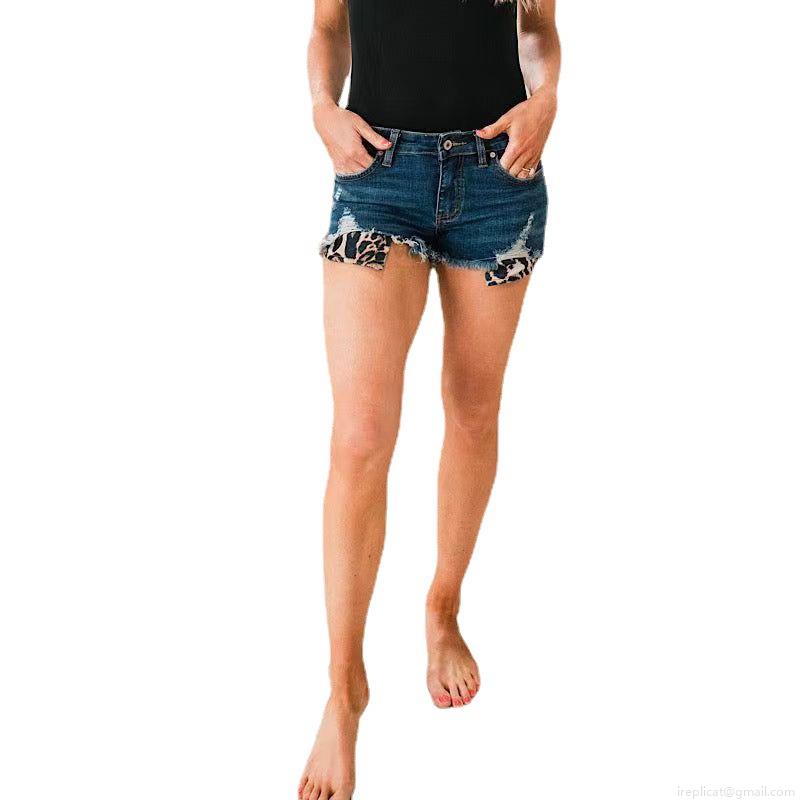 • Women High Waisted Frayed Denim Shorts With Leopard Print Splicing Distressed Raw Hem Casual Streetwear Jean Shorts Cotton Blend