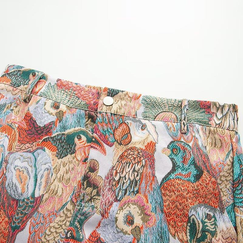 Women Jacquard Bird Print Shorts High Waist Colorful Embroidery Wide Leg Casual Hot Pants for Summer Vacation Sweet Style