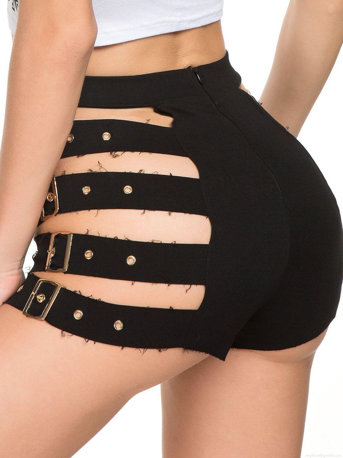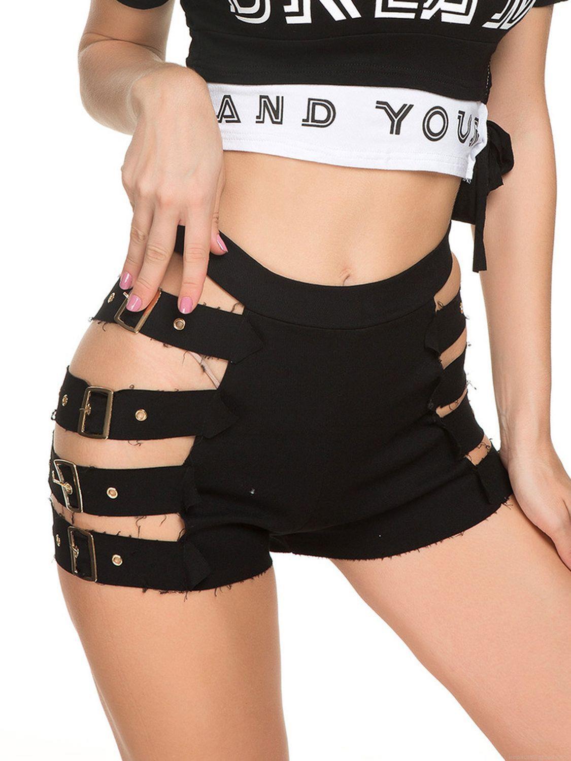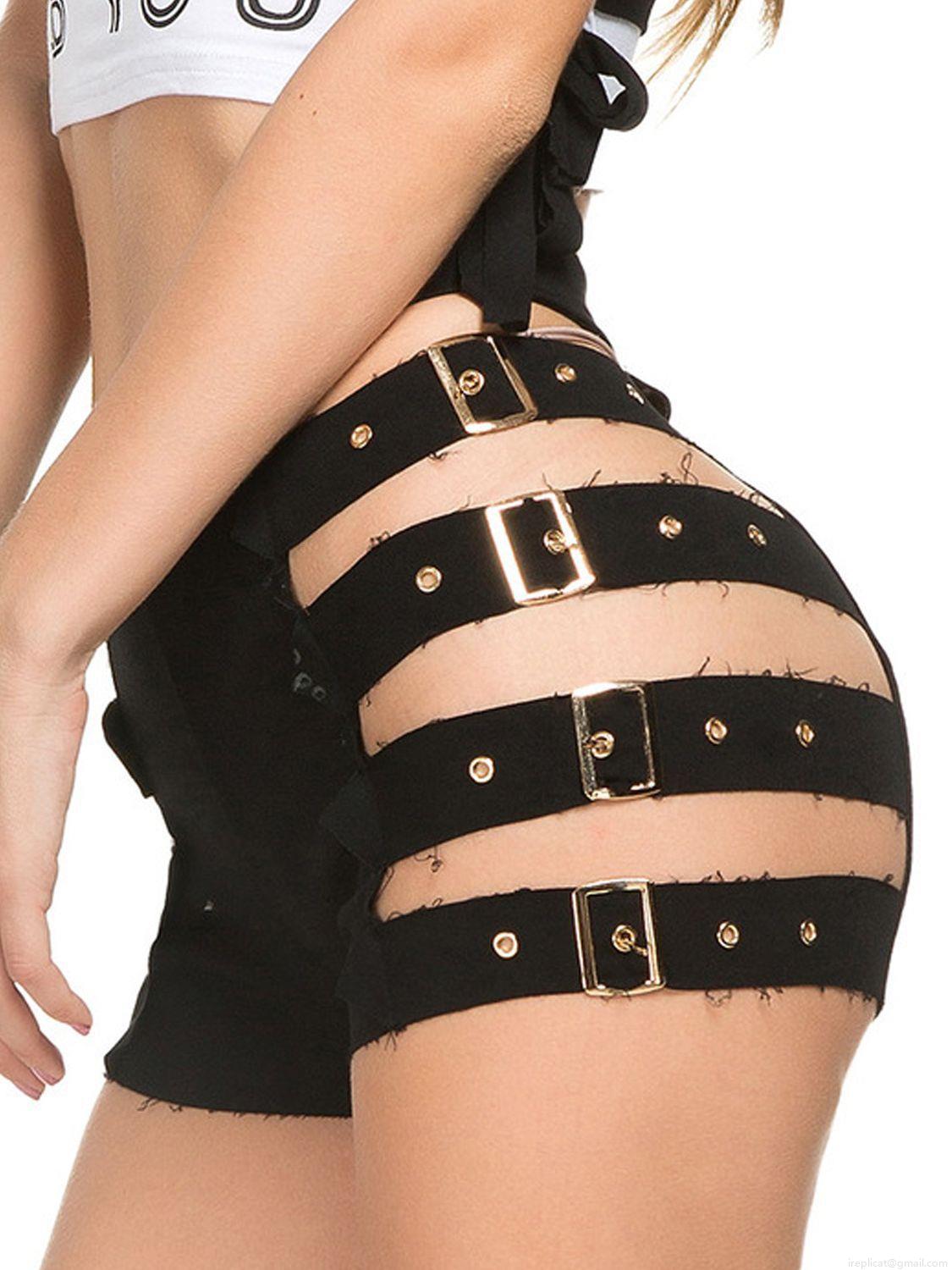 • Women Sexy Side Cut Out Denim Shorts High Waist Mini Hot Pants With Adjustable Metal Buckles Punk Gothic Clubwear Frayed Hem Summer Jean Shorts For Women