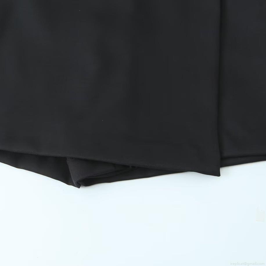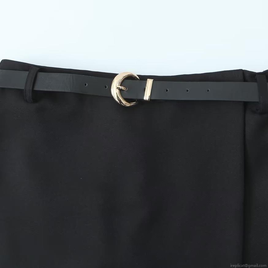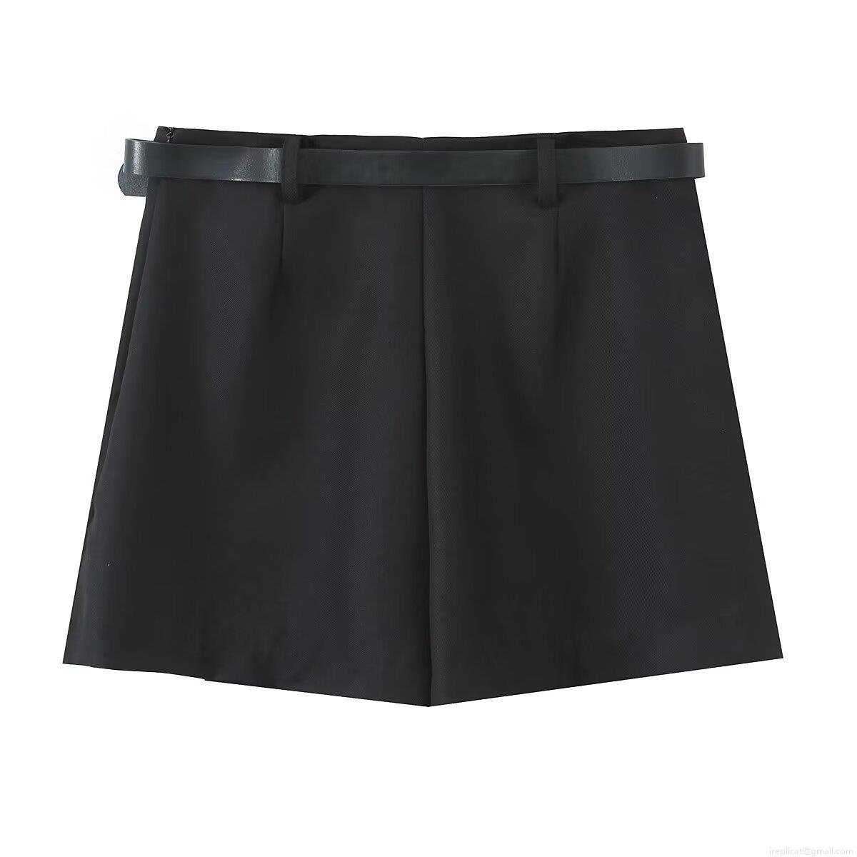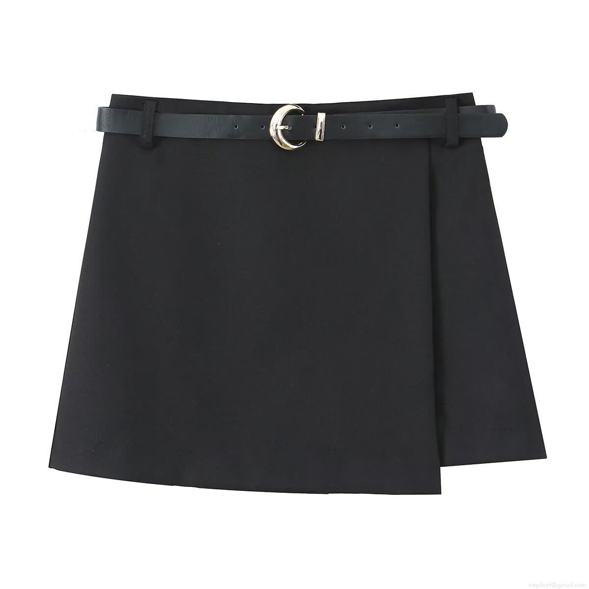 • Women Stylish Casual Black Skort With Leather Belt Golden Moon Buckle Double Breasted Summer Short Skirt Pants High Quality Polyester Commuter Fashion Bottoms