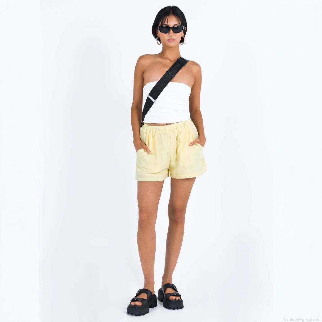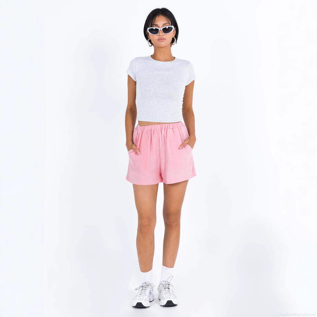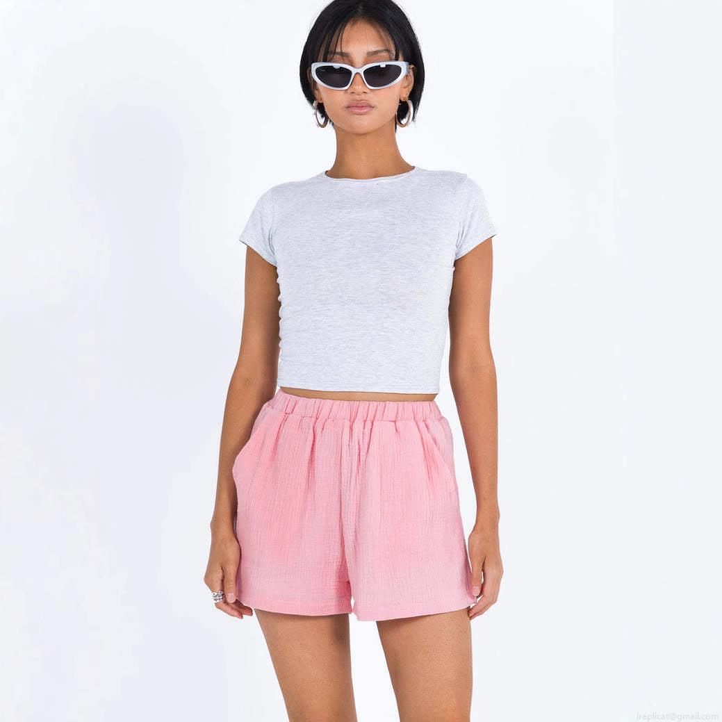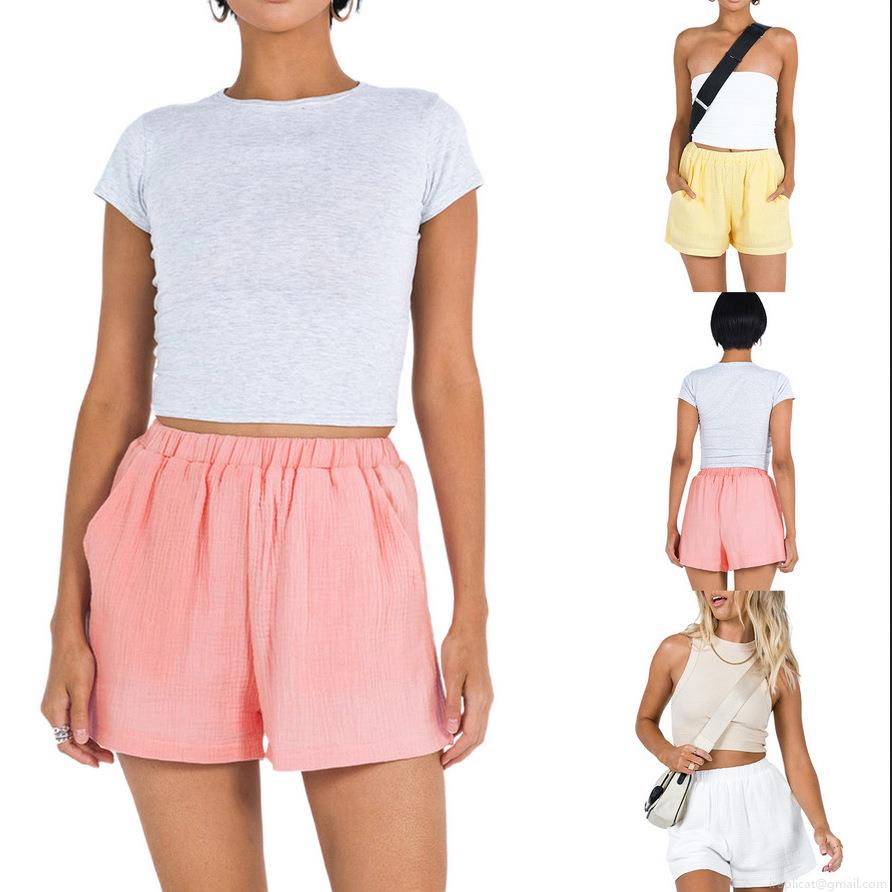 • Women Summer High Waist Loose Shorts Bubble Crepe Texture Casual Beach Shorts Elastic Waist Slimming Solid Color Women Bottoms Fashion Streetwear