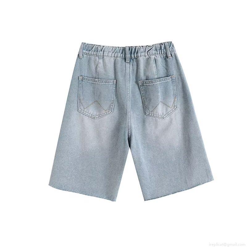 • Women's Casual Elastic High Waist Denim Shorts Loose Fit Straight Leg Light Blue Washed Jean Shorts with Raw Hem and Pockets Five-Point Pants