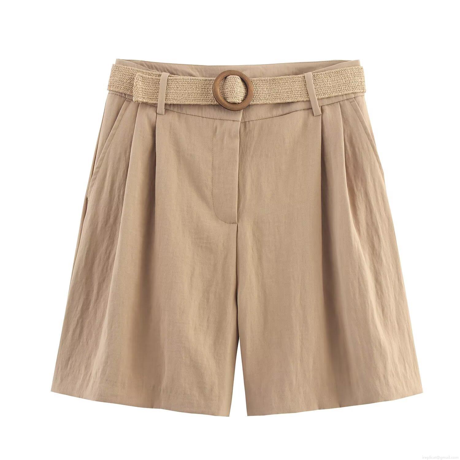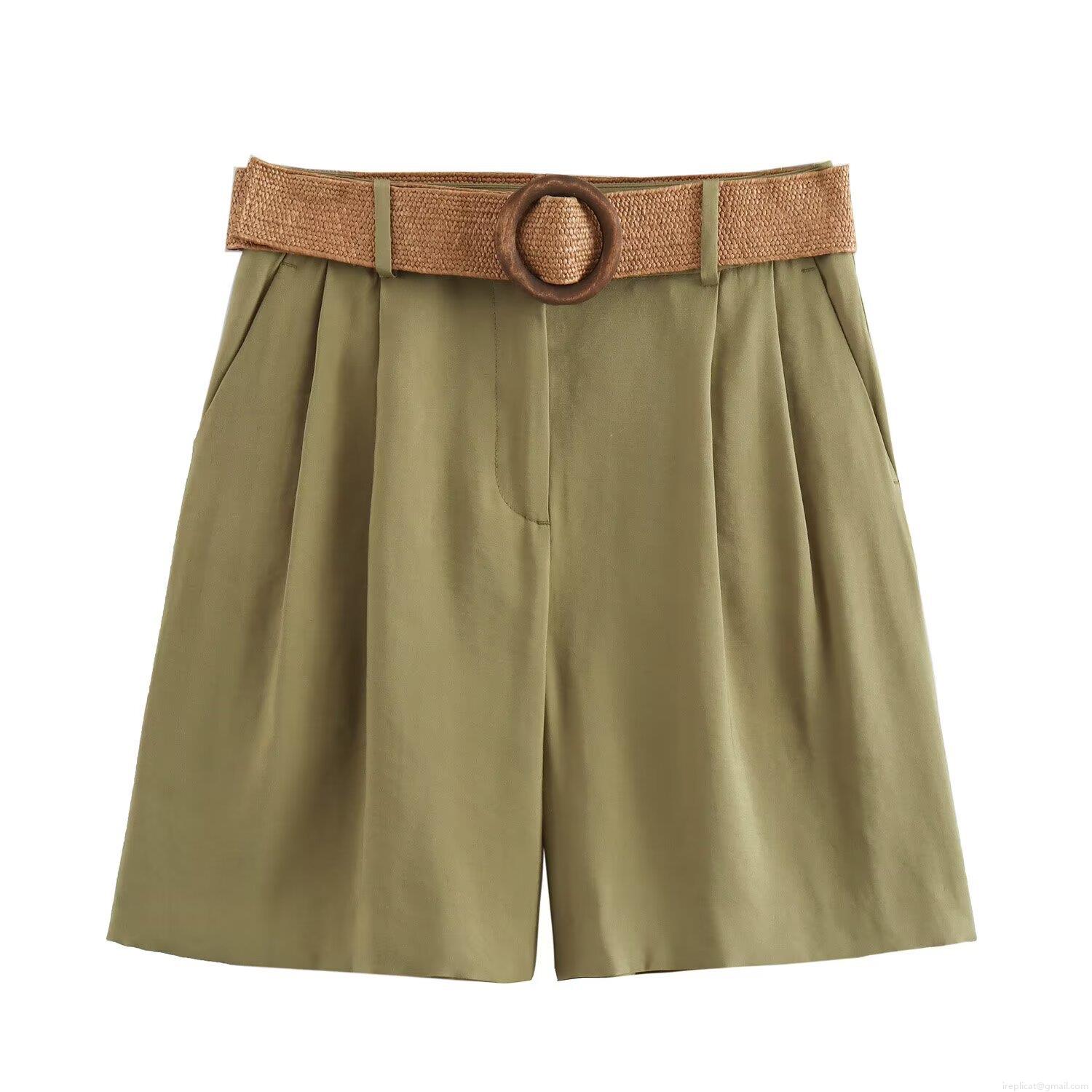 • Women's Casual High Waisted Wide Leg Shorts With Woven Belt Summer Solid Color Polyester Bermuda Shorts For Vacation Streetwear Ladies Fashion