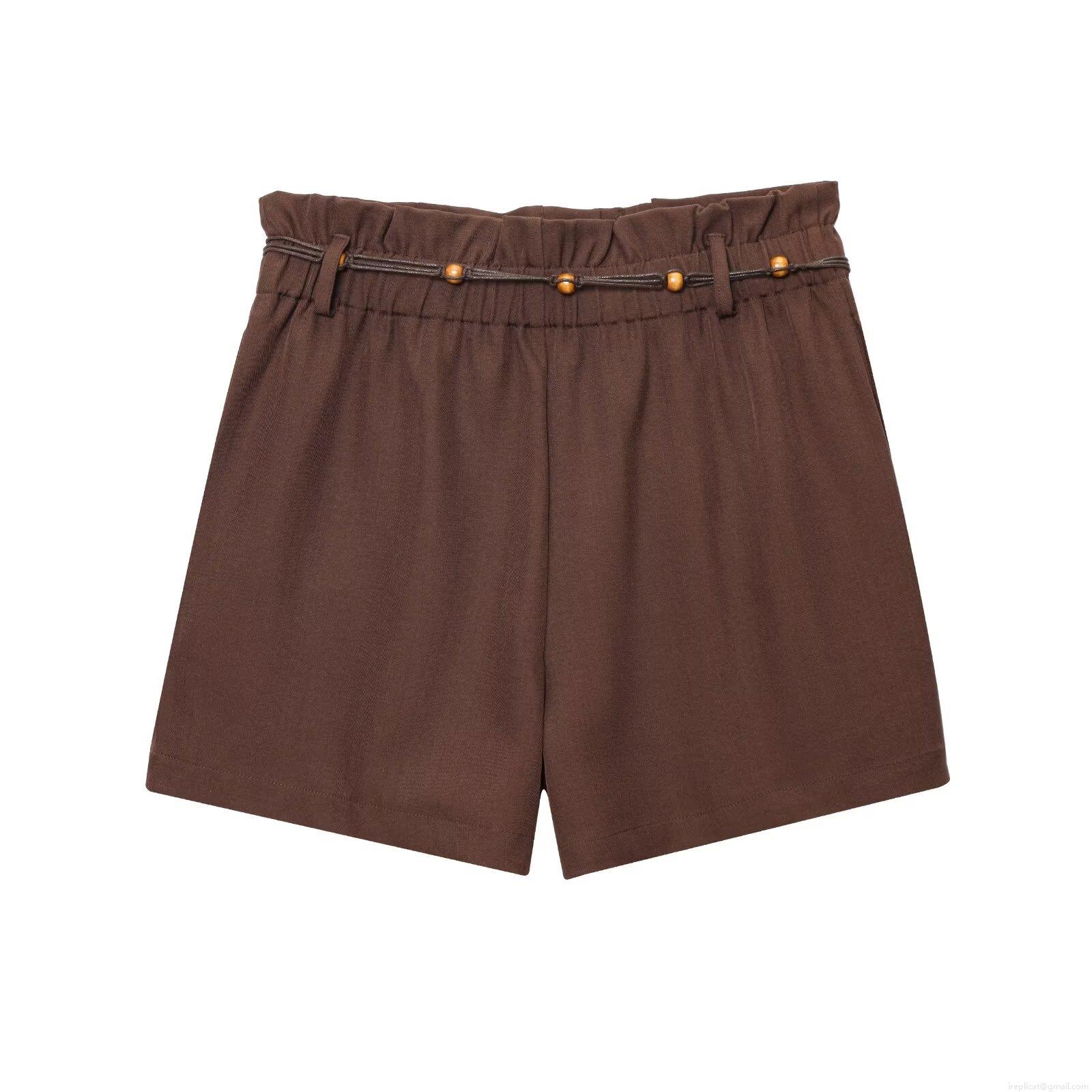 • Women's Casual Shorts With Wood Bead Belt Elastic High Waist Solid Color Straight Leg Polyester Short Pants For Summer Streetwear Vacation Beach Wear