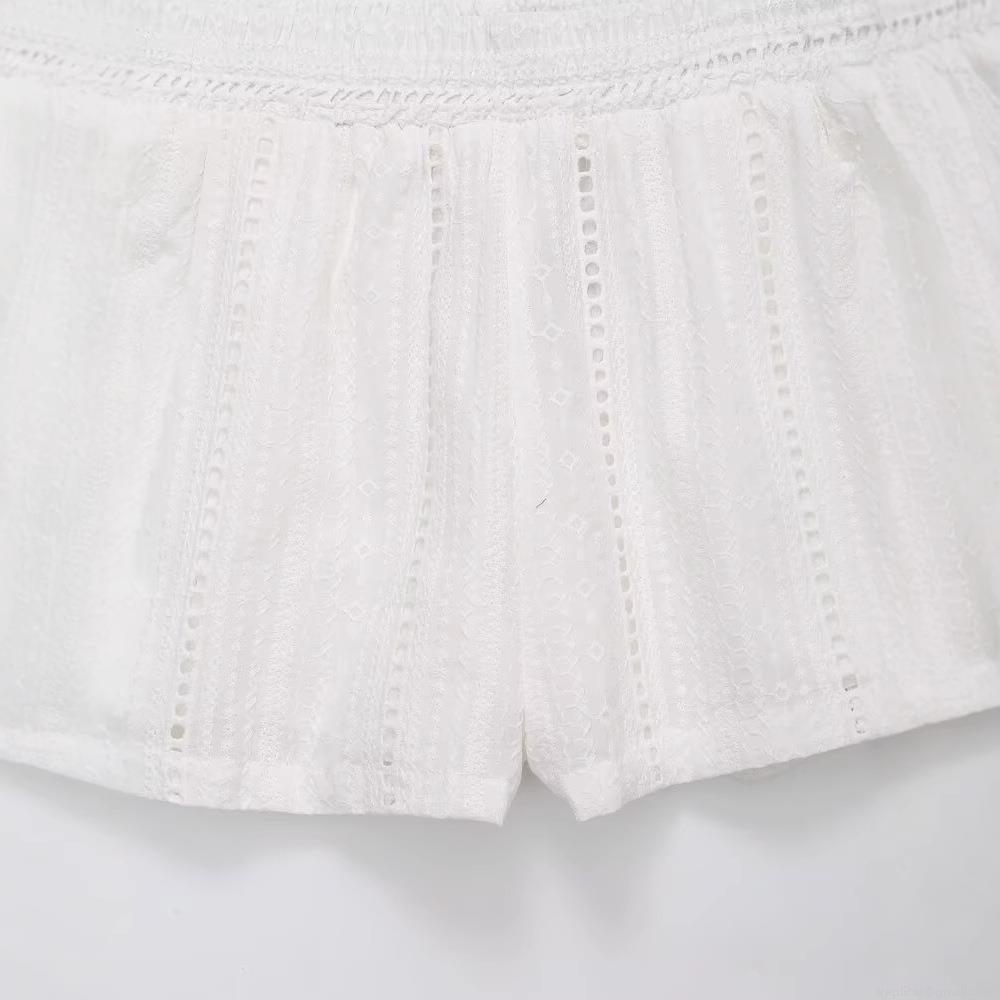 Women's Cotton Polyester Embroidery Hollow Out Shorts Summer Beach Vacation High Waist Elastic Wavy Hem Casual Solid Color Streetwear Shorts for Women