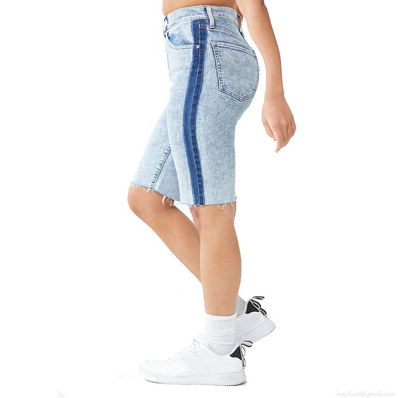 Women's Denim Biker Shorts Contrast Side Stripe High Stretch Cotton Blend Washed Raw Hem Mid Waist Skinny Cycling Shorts Summer Streetwear