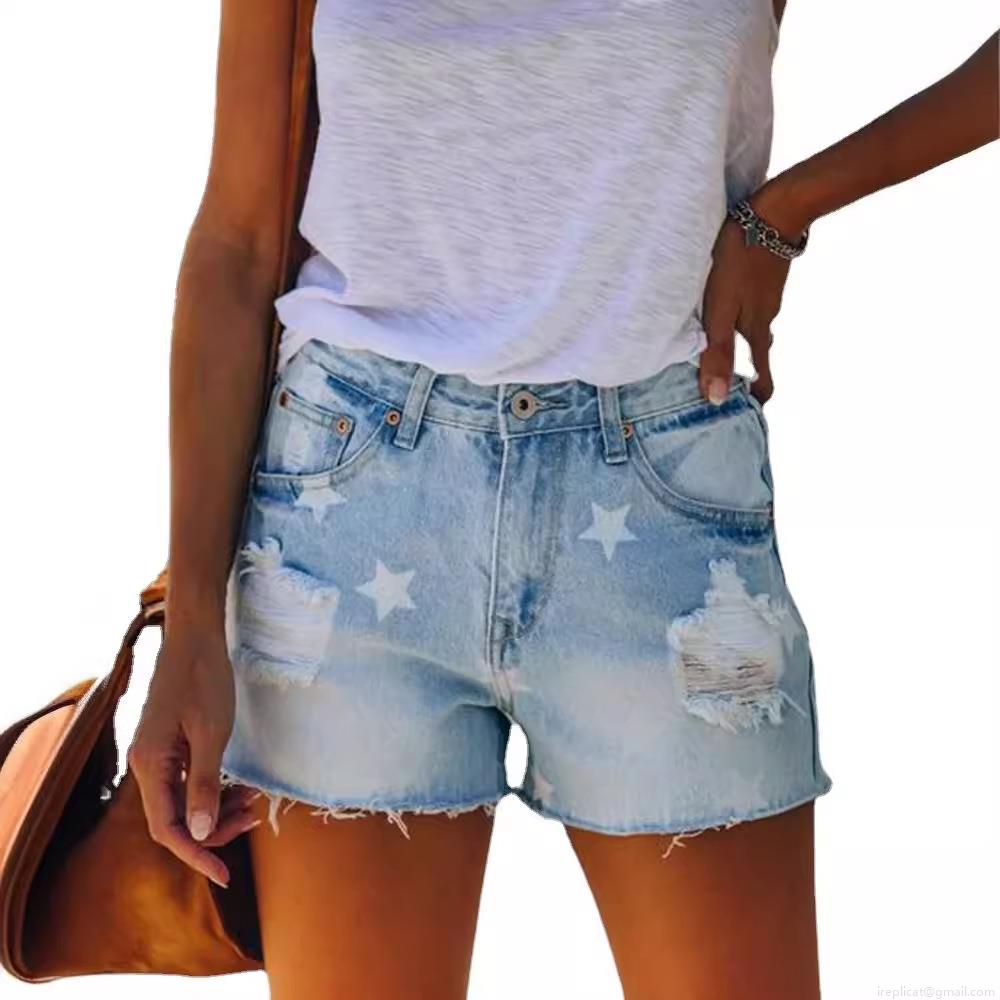 Women's Denim Shorts With Star Print Distressed Ripped Frayed Hem Cotton Blend Jeans Shorts For Summer Casual Outfits