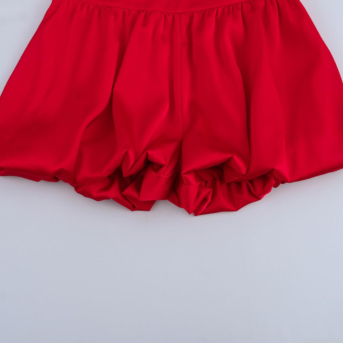 • Women's Elegant Red Satin Bubble Shorts Mid Waist Pleated Bloom Shorts With Hidden Zipper Summer Casual Solid Color Polyester Hot Pants