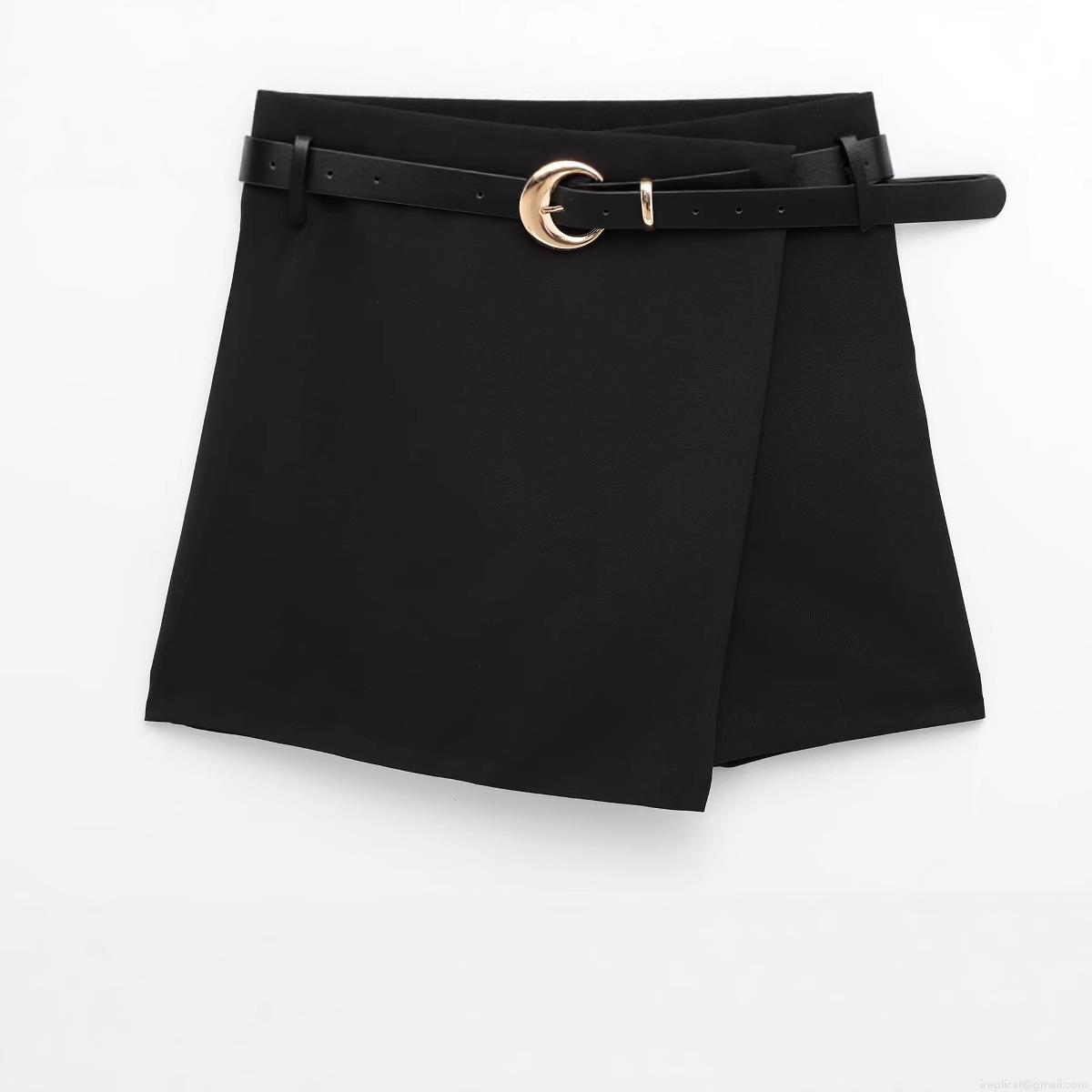 Women's Fashion Black Wrap Skort With Gold Moon Buckle Belt High Waist Mini Skirt Shorts For Summer Casual Party Sweet Style Ladies Clothing