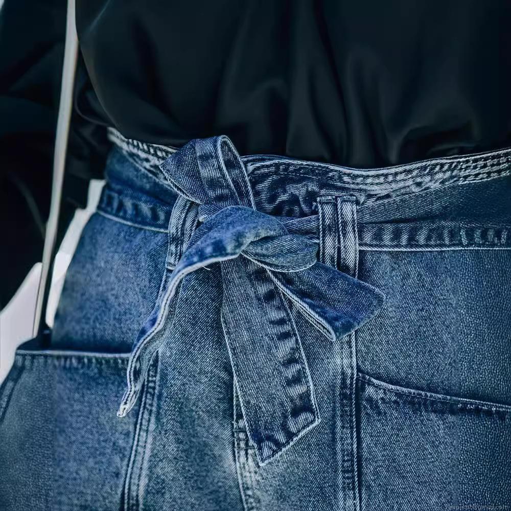 Solid Color, Water Wash, Straight Tube, High-waisted, Ribbon Bow, Washed Texture, Big Pocket
