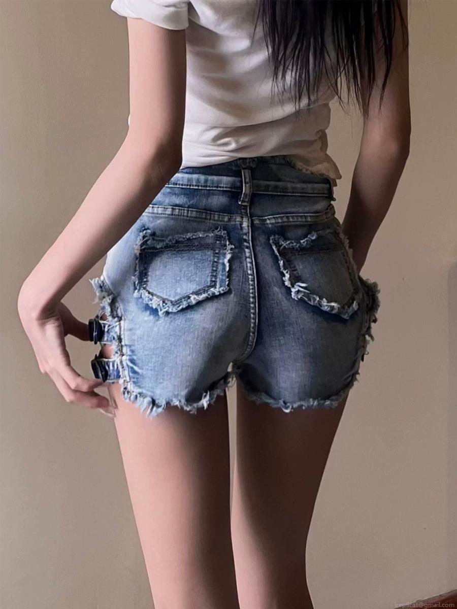 • Women's High Waist Denim Shorts With Side Hollow Out Metal Buckles Distressed Raw Hem Light Blue Jean Hot Pants For Club Streetwear Party