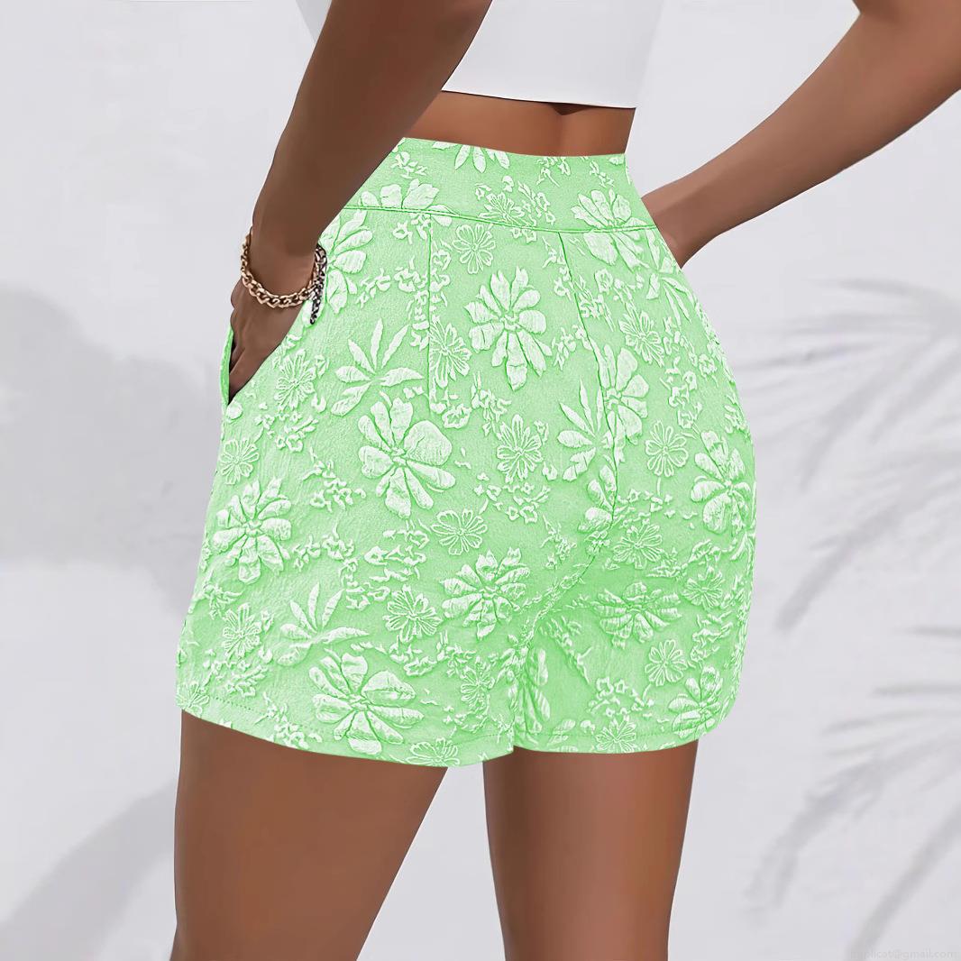 • Women's High Waist Jacquard Floral Shorts Summer Casual Slim Fit Mini Pants With Pockets Elegant Textured Polyester Spandex Shorts Pink Black Green
