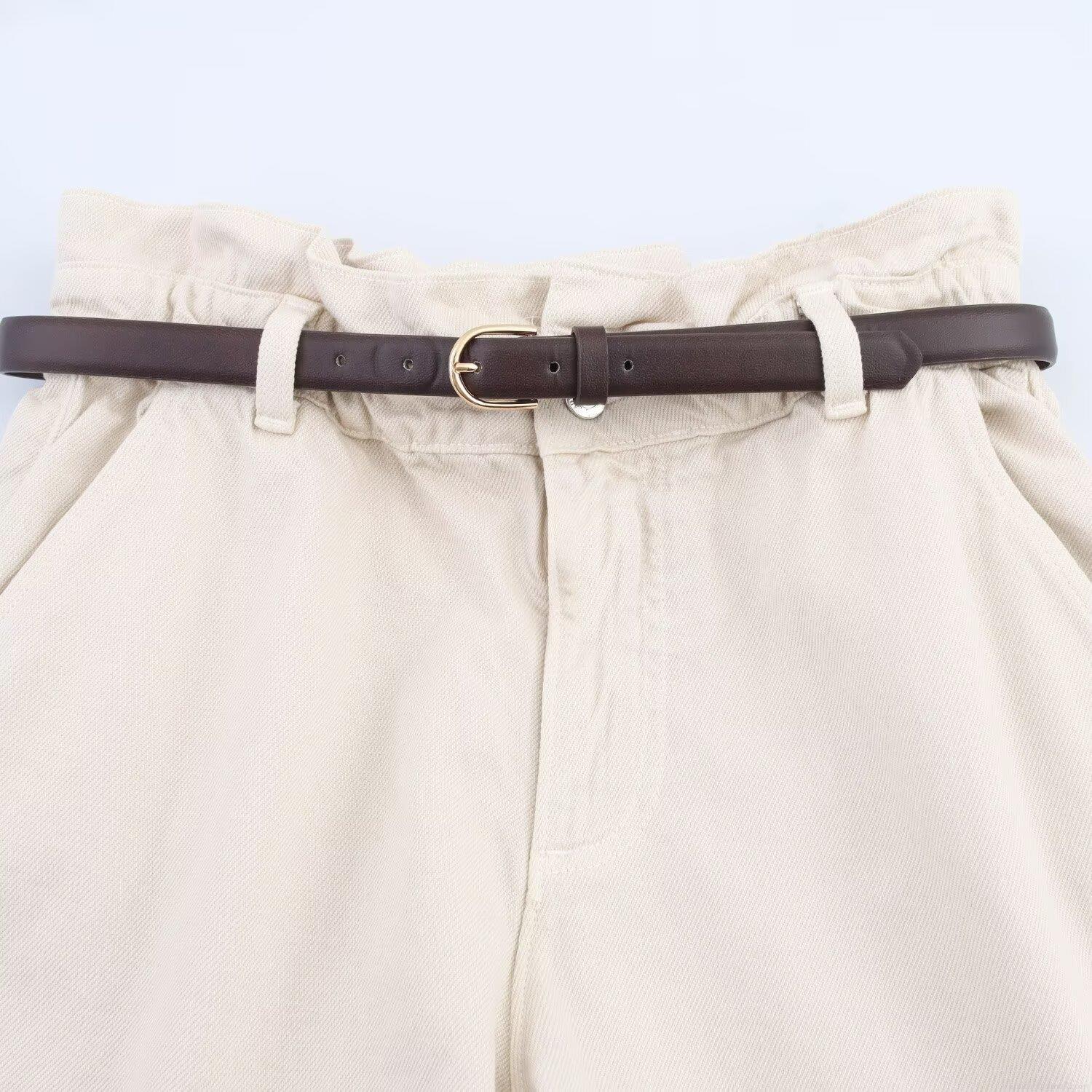 Solid Color, Water Wash, Pleats, Flip-edge, Belt, Paper Bag Waist