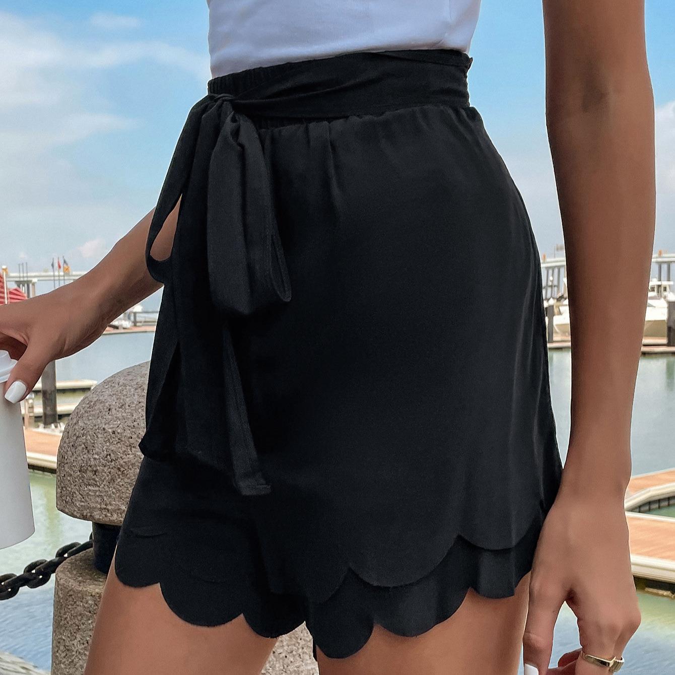 • Women's High Waist Scalloped Hem Shorts With Bow Tie Casual Summer Beach Wide Leg Short Pants Sweet Elegant Solid Color Scalloped Edge Shorts