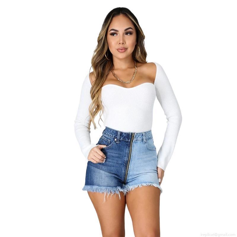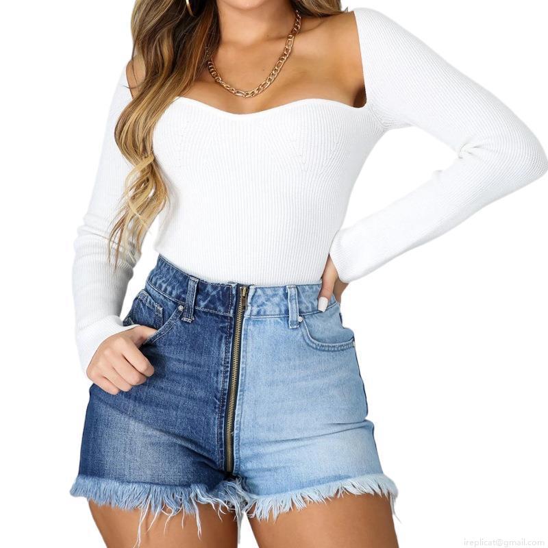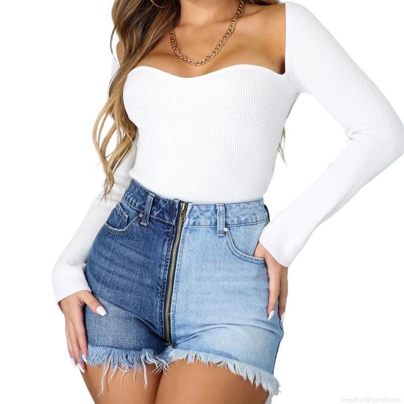 • Women's High Waist Two-Tone Denim Shorts Stretchy Patchwork Contrast Blue Jean Shorts With Long Zipper Raw Hem Slimming Streetwear Bottoms