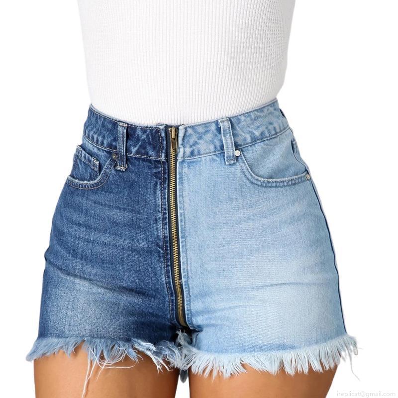Women's High Waist Two-Tone Denim Shorts Stretchy Patchwork Contrast Blue Jean Shorts With Long Zipper Raw Hem Slimming Streetwear Bottoms