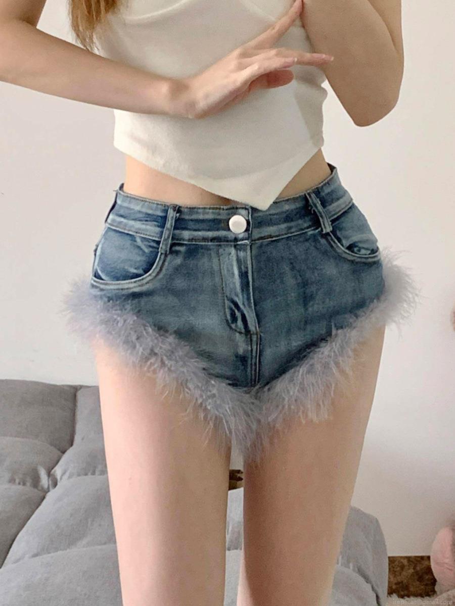 Women's High Waisted Blue Denim Shorts With Grey Faux Feather Trim Sexy High Stretch Cotton Hot Pants For Party Clubwear Y2K Streetwear