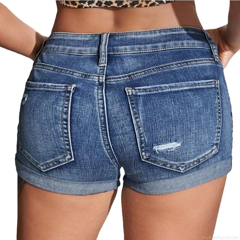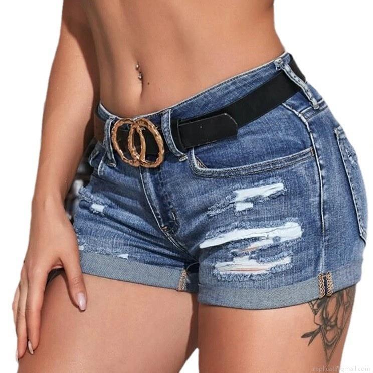 • Women's High Waisted Distressed Denim Shorts With Double Ring Belt Ripped Raw Hem Stretchy Washed Light Blue Cotton Blend Jean Shorts Summer Streetwear