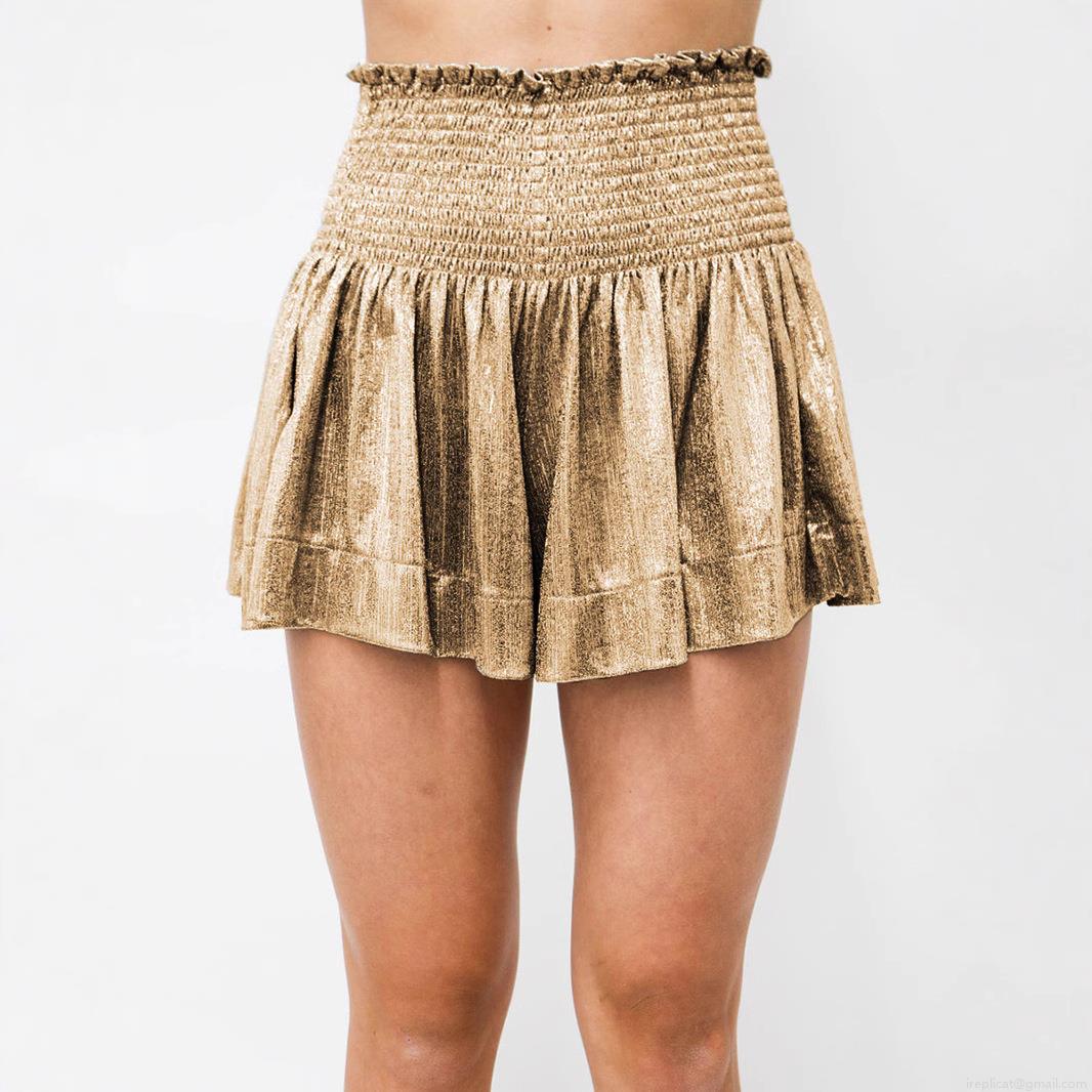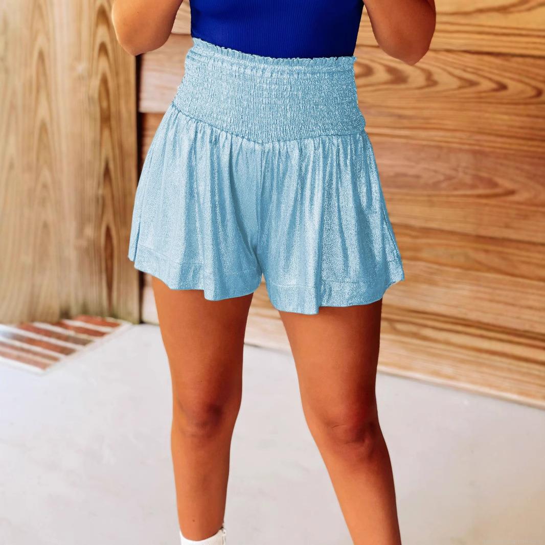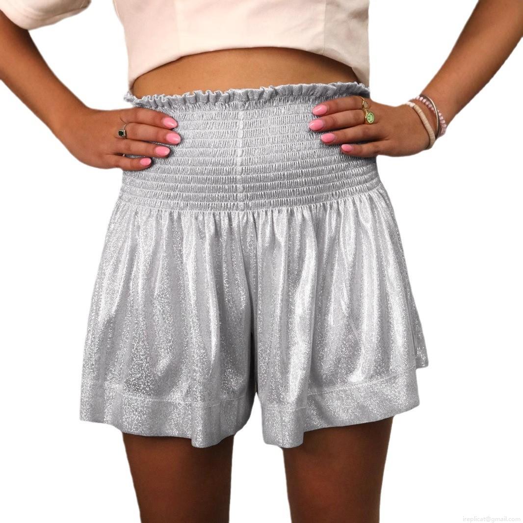 Women's Metallic Shiny Shorts High Waist Smocked Elastic Waist Ruffle Hem Skort Disco Party Clubwear Fashion Wide Leg Shorts