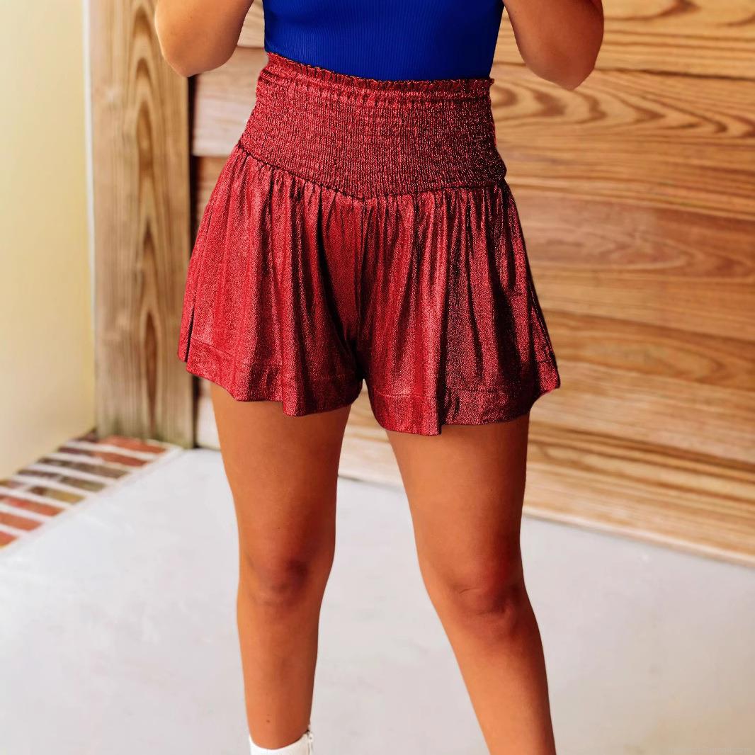 • Women's Metallic Shiny Shorts High Waist Smocked Elastic Waist Ruffle Hem Skort Disco Party Clubwear Fashion Wide Leg Shorts