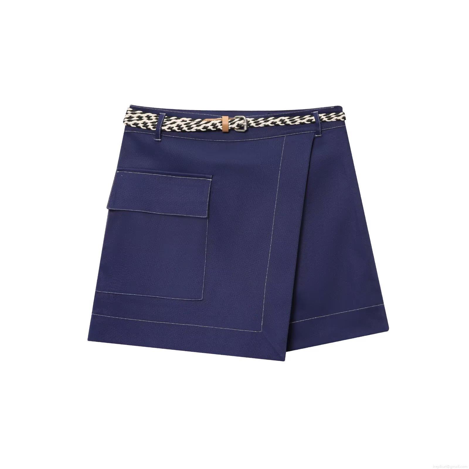 Women's Navy Blue Polyester Skort With Braided Belt Contrast White Stitching High Waist Wrap Design Mini Skirt Shorts For Casual Summer Fashion Lady Clothes