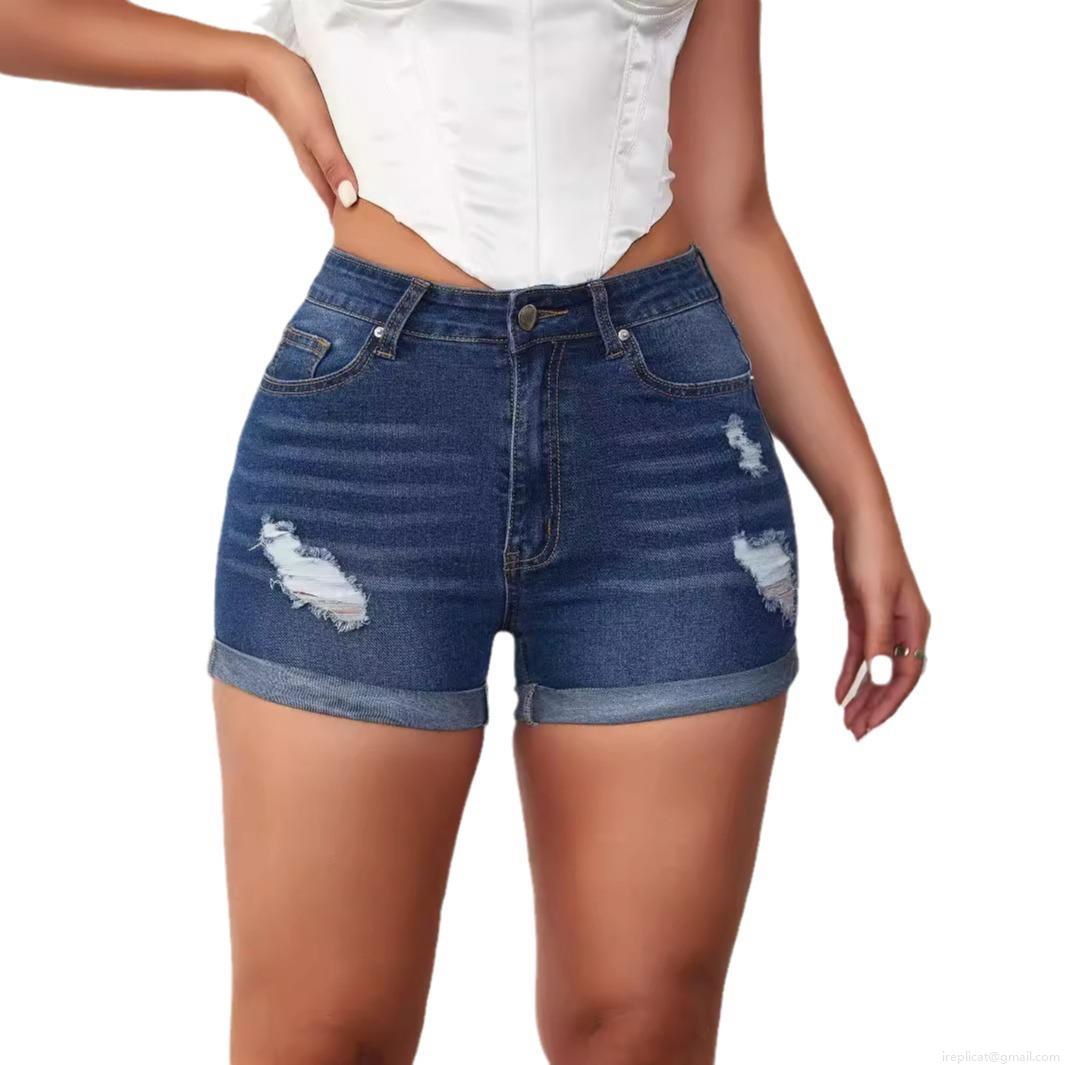 • Women's Ripped Denim Shorts High Waist Distressed Cuffed Hem Jean Shorts Summer Casual Daily Wear Streetwear Dark Blue Cotton Blend