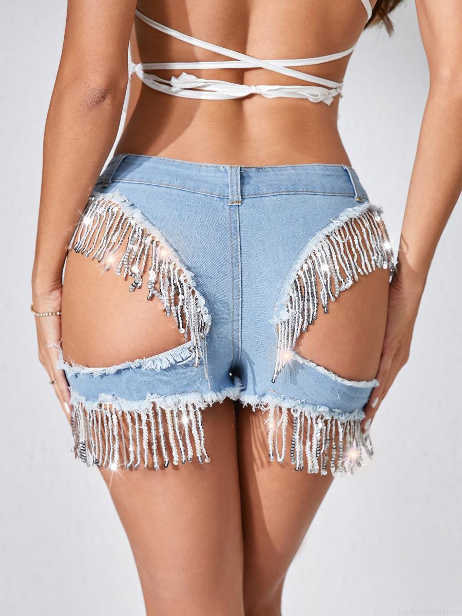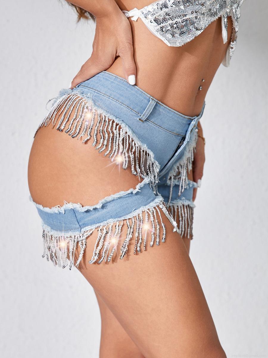 • Women's Sexy Hollow Out Sequin Fringe Denim Shorts High Waist Distressed Pale Blue Denim Hot Pants With Silver Tassels For Music Festival Nightclub Party Stage Wear