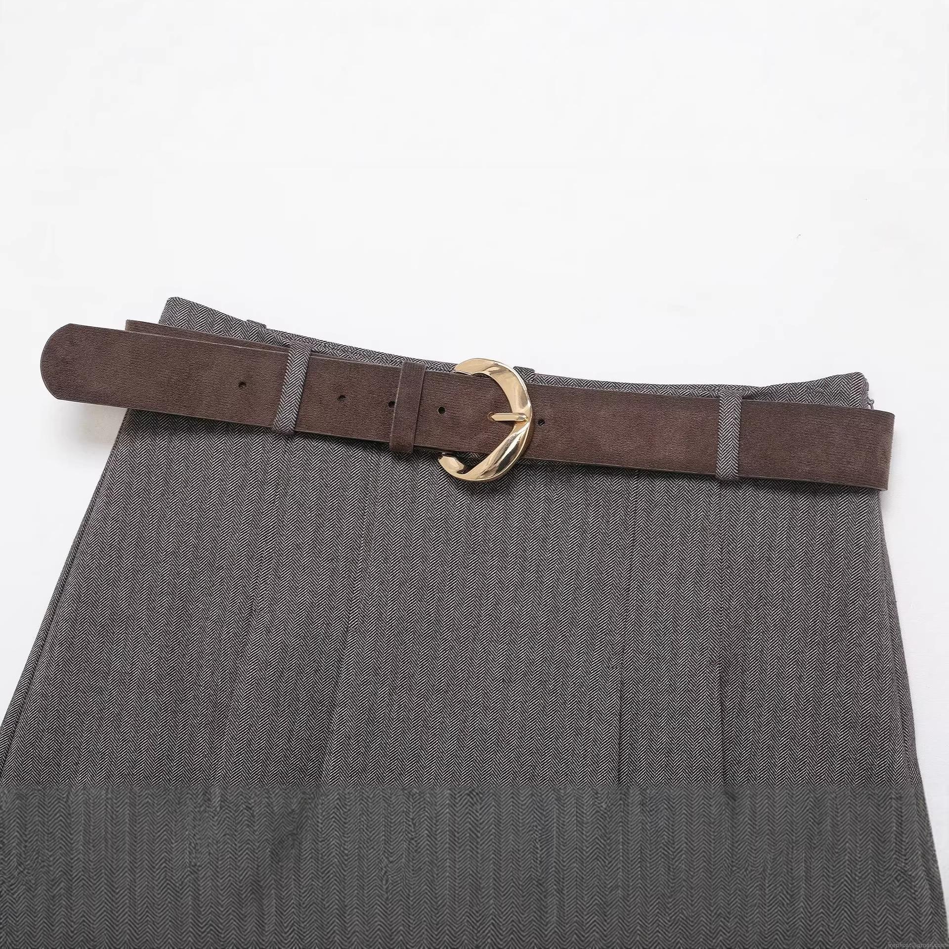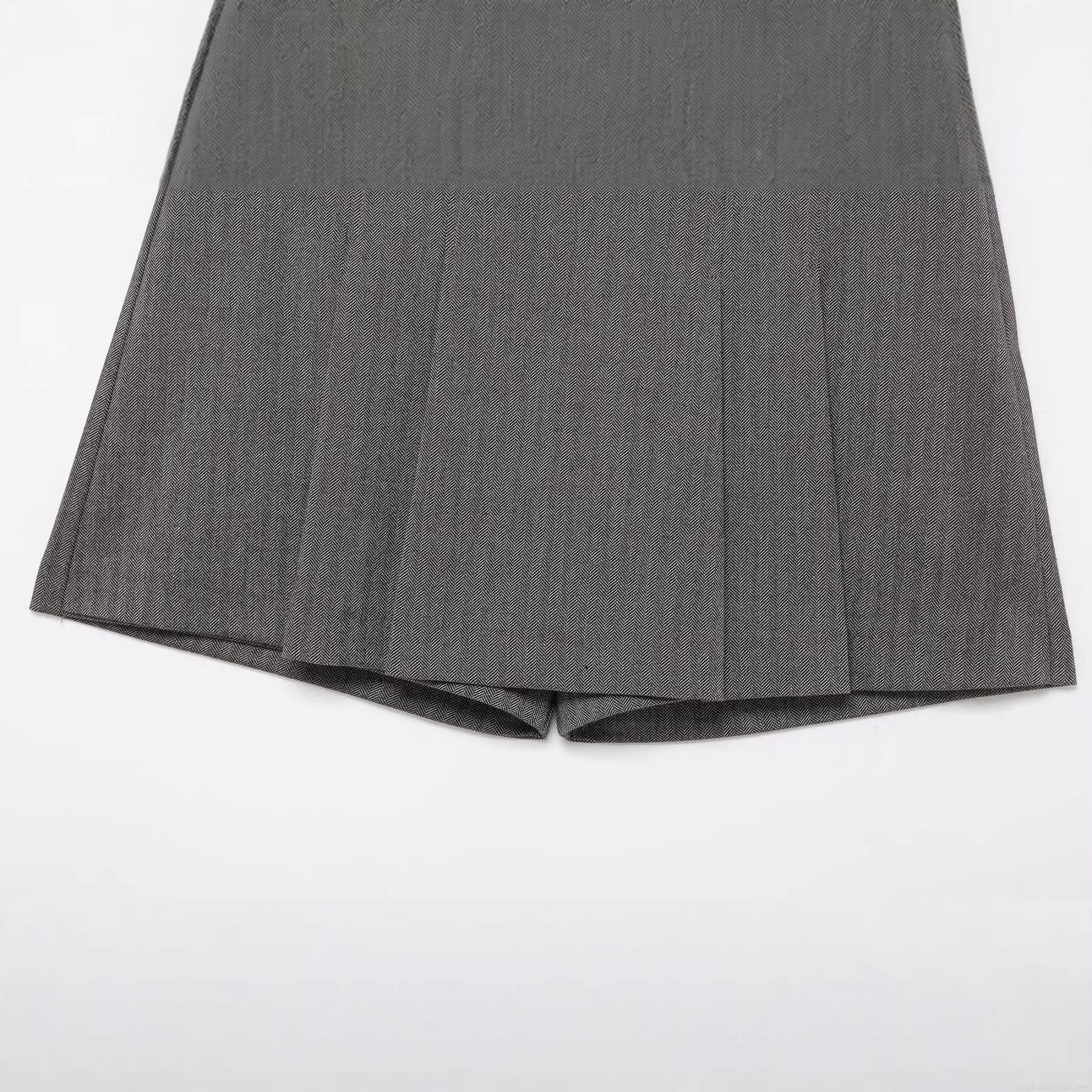• Women's Vintage Herringbone High Waist Pleated Skorts With Brown Suede Belt Elegant Grey Mini Shorts For Autumn Winter Daily Wear