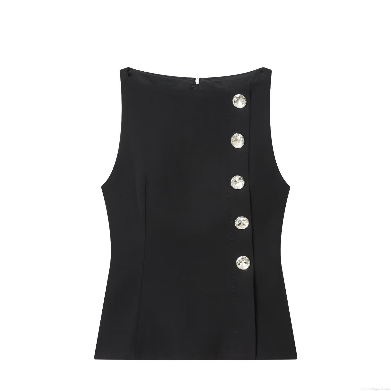 Elegant Women Black Sleeveless Top and Bow Decoration Skort Set Polyester Crystal Buttons Two-Piece Outfit for Summer Office Lady Party Casual Wear