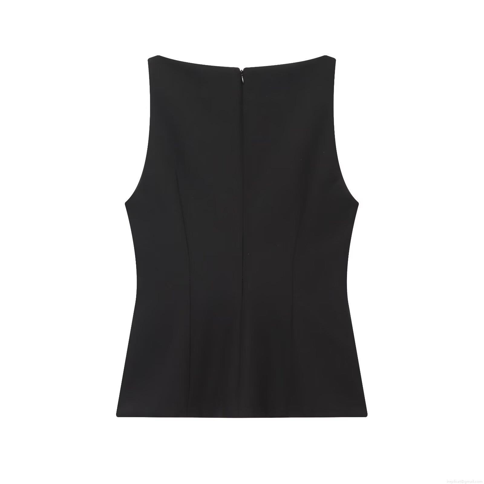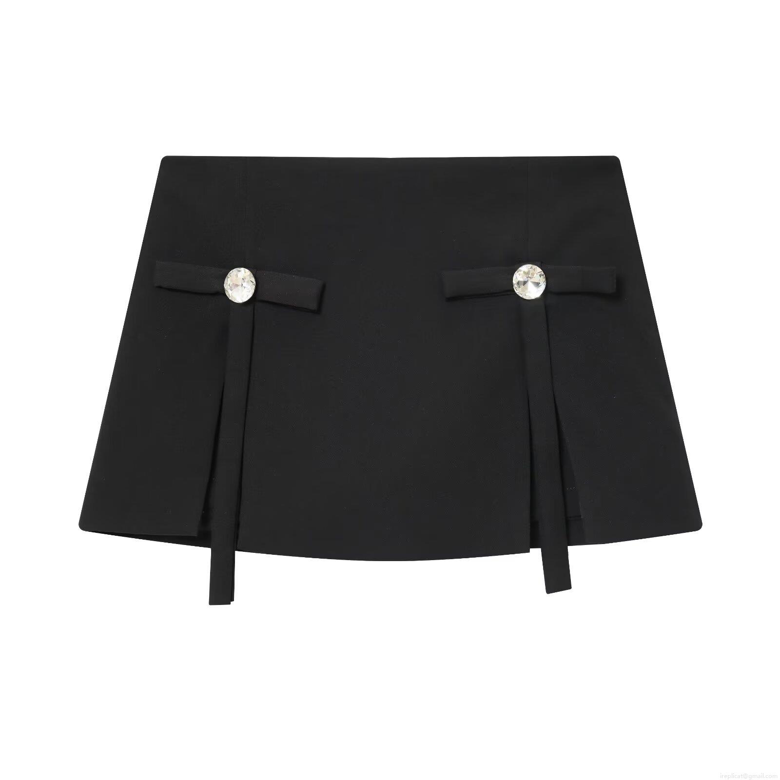 • Elegant Women Black Sleeveless Top and Bow Decoration Skort Set Polyester Crystal Buttons Two-Piece Outfit for Summer Office Lady Party Casual Wear