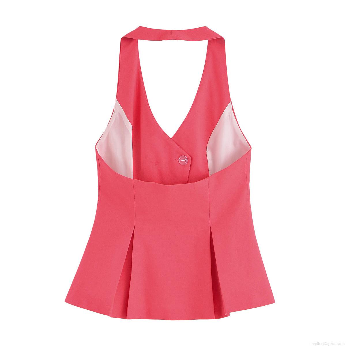 • Hot Pink Women Halter V Neck Button Vest And High Waist Pleated Shorts Set Summer Sexy Backless Sleeveless Solid Color Polyester Casual Two Piece Outfit Streetwear