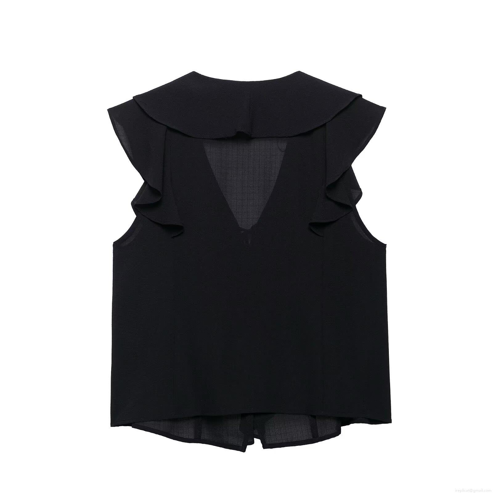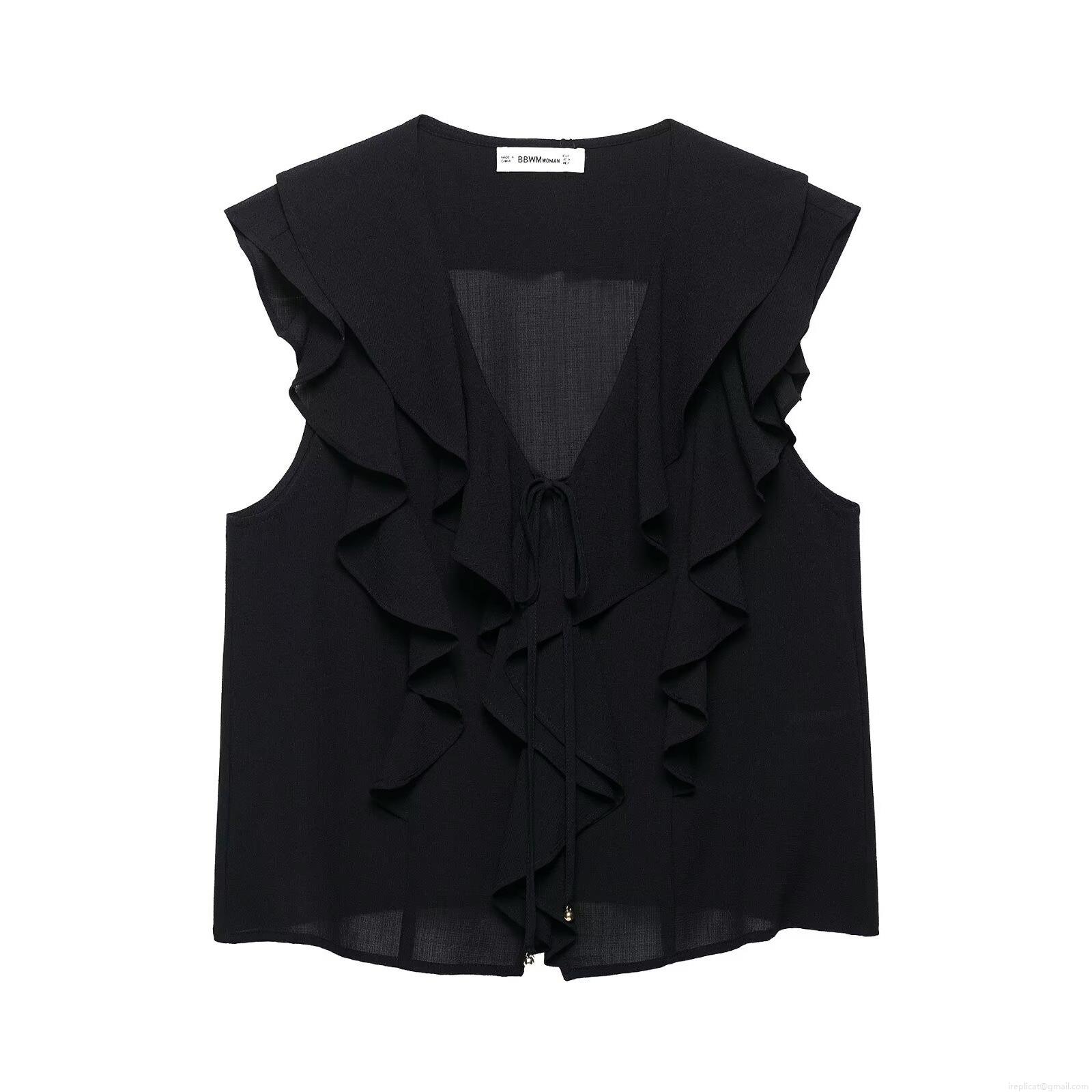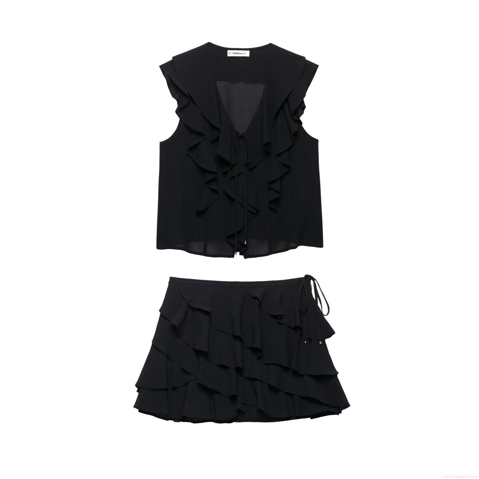 • Women 2 Piece Summer Outfits Deep V Neck Ruffle Top And Tiered Ruffle Skort Set Solid Black Polyester Casual Streetwear Vacation Sets For Women